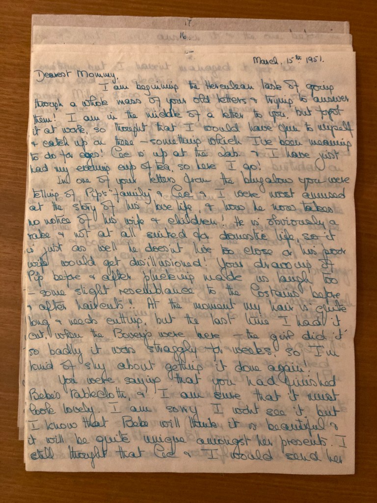 I am beginning the Herculean task of going through a whole mass of your old letters & trying to answer them! I am in the middle of a letter to you, but forgot it at work, so I thought that I would have fun to myself & catch up on these- something which I’ve been meaning to do for ages! Cec is up at the Lab. & I have just had my evening cup of tea, so here I go!