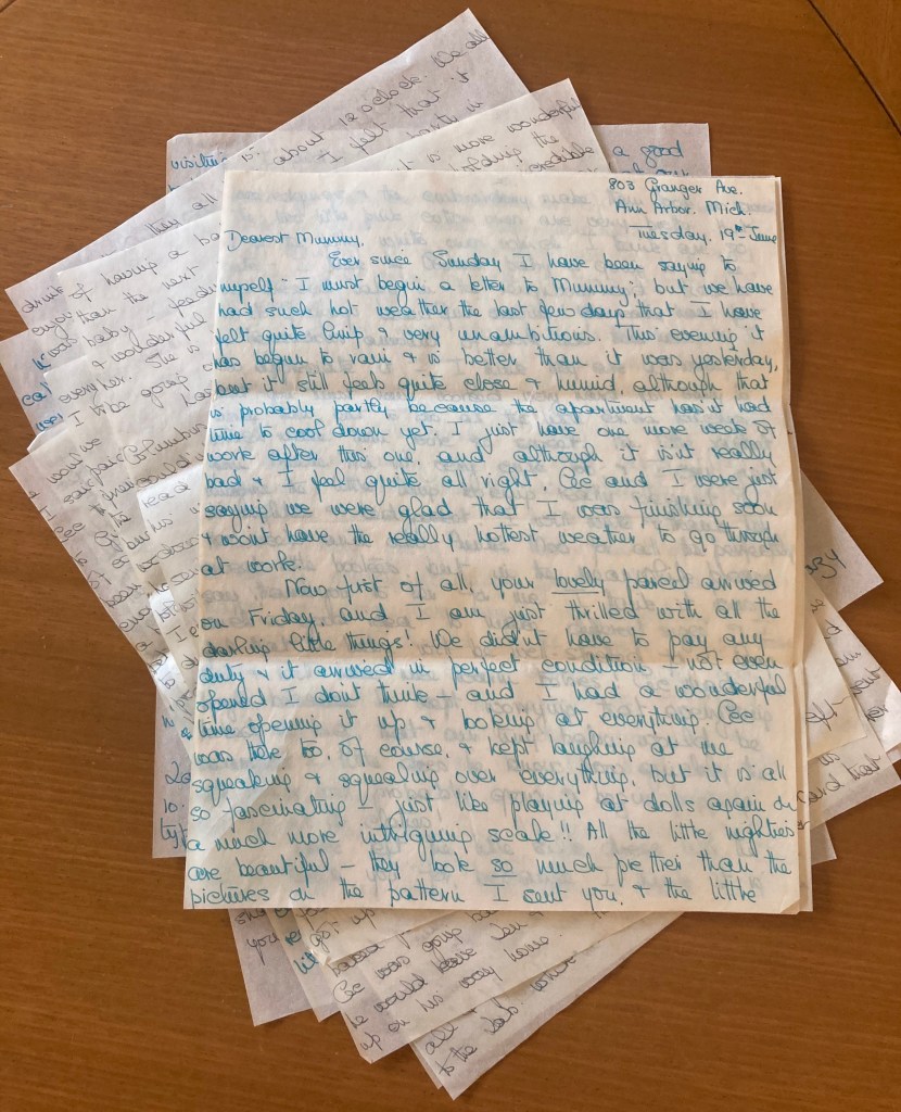I have left the little silk dress to the last thank you for, because I think it is quite the pièce de la résistance of the whole parcel – and I am just enchanted with it! I keep bringing it out to have another look and another gloat over it, and I think it is absolutely the darlingest little dress I ever saw. I can see what a job you must have had making it out of those small pieces, but your faggotting [This is an embroidery stitch used to attach one piece of material to another- to lengthen a hem, for example] is lovely and no one would ever know that it was done with any ulterior motive- Cec said “My— open-work seams!” when he saw them. The silk is really lovely, isn’t it, and it is amazing to think that it has lasted so long and is still so perfect, and I think that soft creamy colour is very pretty for a baby, don’t you? Altogether, it was a simply wonderful parcel, Mummy, & thank you very very much for everything – I am getting quite thrilled at the “layette” now – there seems to be quite a lot of different things, even though I haven’t got the nappies etc. I intend to buy here. I got 2 little cotton vests, but they are 2nd size & at the time they had none of the smaller size, so I decided to wait & get them when they came in. Another present which I just got on Monday was a big surprise. When I came into my office, here it was a dear little parcel all wrapped in baby paper on my desk, & inside was another sweet little pair of white booties. They were from a girl, Janet Jackson, who worked here, but although she gave me a lift sometimes before we had MacTavish I didn’t know her very well. Her husband graduated this month & got a job in Illinois, so she left about a fortnight ago & I gave 25¢ towards a present for her as we usually do, but never thought about her giving me anything, so it was a real surprise. She had been in A.A. over the weekend collecting the last of their things & had got one of the other girls to put the little parcel on my desk – I thought it was so sweet of her, and as they are bigger than Auntie Moo’s, they will just fit in nicely.