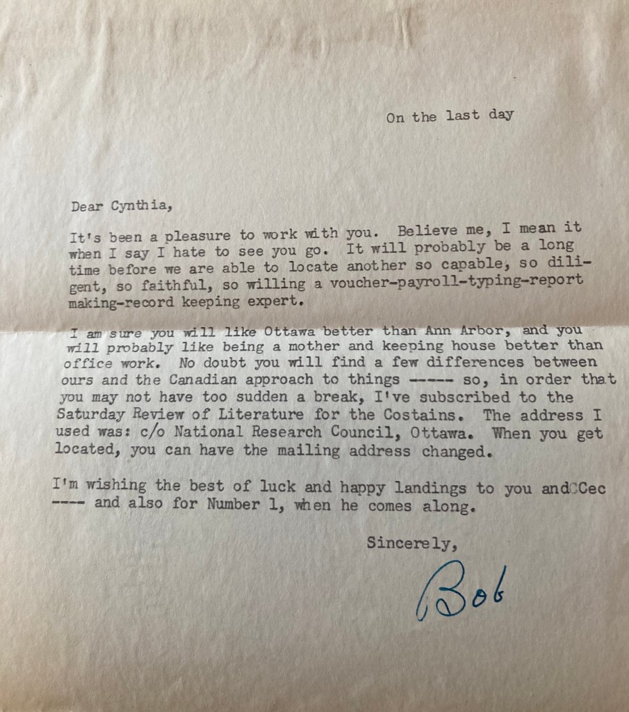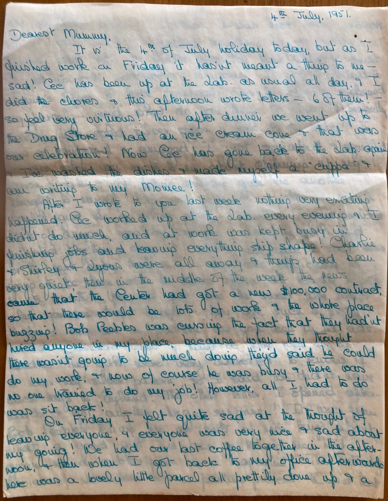 After I wrote to you last week nothing very exciting happened. Cec worked at the Lab. every evening & I didn’t do much, and at work was kept busy in finishing jobs and leaving everything ship shape! Charlie & Shirley & Lyons were all the way & things had been very quiet, then in the middle of the week the news came that the Center had got a new $100,000 contract, so that there would be lots of work & the whole place buzzing! Bob Peebles was cursing the fact that they hadn’t hired anyone in my place, because when they thought there wasn’t going to be much doing they’d said he could do my work, & now of course he was busy & there was no one trained to do my job! However, all I had to do was sit back!