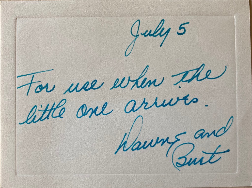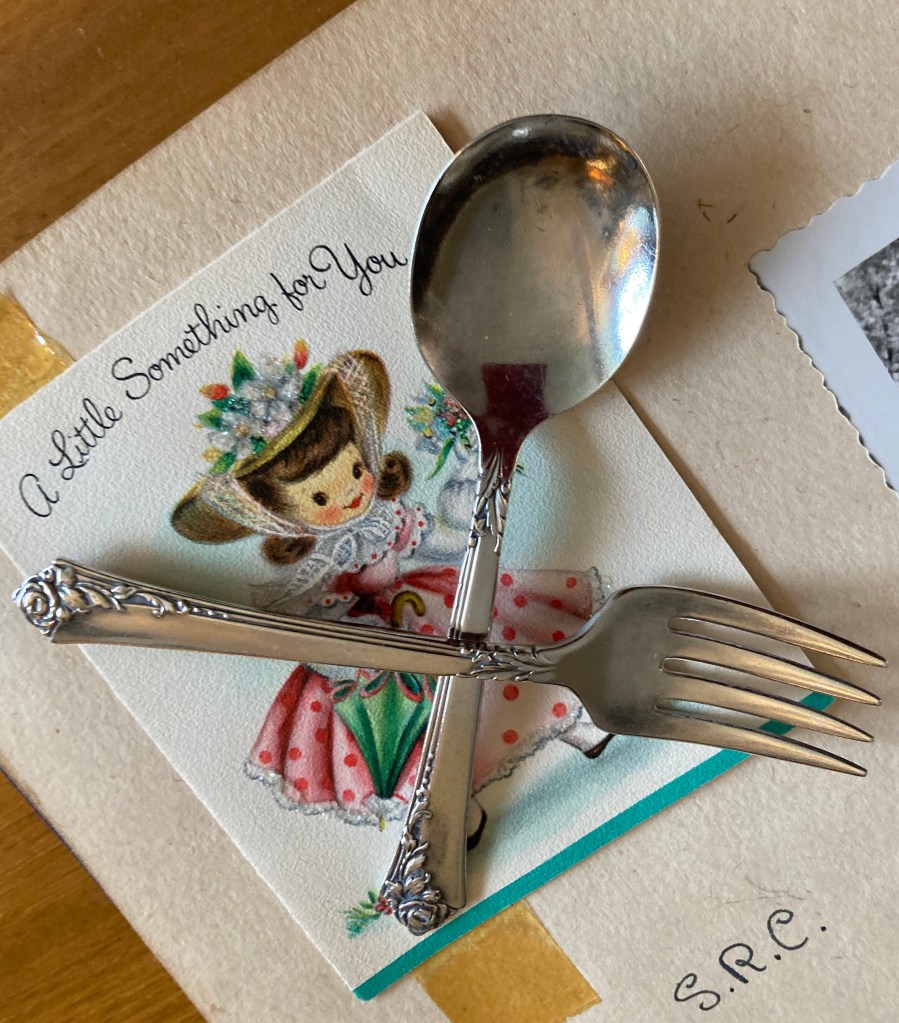 A perfectly darling little solid silver spoon & fork for the baby! I was so surprised & amazed I just squeaked & squealed because when you wrote to me about cleaning up my spoon. & fork & not letting anyone give me another, I thought to myself “Well, my goodness – who on earth would give me a silver spoon & fork!” & I just couldn’t think of anyone wealthy enough, & here the girls had collected together & done it! We’ll just have to save mine for the next baby, that’s all- this one obviously is going to be born with a silver spoon all ready to pop in its mouth! You will just love the sweet little things when you see them though – they are such a pretty shape & they are a “pattern” as you see in the ads. called Damask Rose” & have a little rose on the handle. The girls were very interested to know if it was my “silver pattern”, so I said we didn’t have such things in England! The other letter, I opened it afterwards, & got another huge surprise! It was from Bob Peebles telling me all sorts of nice things about what a good girl I’d been & telling me he had given me a subscription to a magazine “The Saturday Review of Literature” as a parting present. Wasn’t that nice of him?