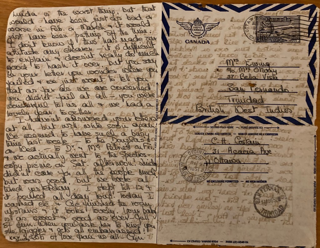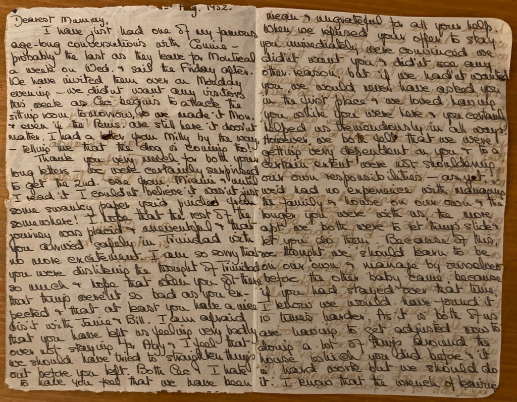 Thank you very much for both your long letters- we were certainly surprised to get the 2nd one from Miami & until I read it I couldn’t believe it wasn’t just some swanky paper you’d pinched from somewhere! I hope the rest of the journey was placid & uneventful & that you arrived safely in Trinidad with no more excitement. I am so sorry that you were disliking the thought of Trinidad so much & hope that when you got there that things weren’t so bad as you expected & that at least you have a nice visit with Janie & Bill. I am afraid that you have left us feeling very badly over not staying for Algy & I feel that we should have tried to straighten things out before you left. Both Cec & I hate to have you feel that we have being mean & ungrateful for all your help. When we refused your offer to stay you immediately were convinced we didn’t want you & didn’t see any other reason, but if we hadn’t wanted you, we would never have asked you in the first place & we loved having you while you were here & you certainly helped us tremendously in all ways. However, we both felt that we were getting very dependent on you & to a certain extent were not shouldering our own responsibilities- as yet, we’ve had no experience with managing the family & house on our own & the longer you were with us, the more apt we both were to let things slide & let you do them. Because of this, we thought we should learn to be on our own & manage by ourselves before the other baby came, because if you had stayed over that time, I know we would have found it 10 times harder. As it is both of us are having to get adjusted now to doing a lot of things around the house which you did before & it is hard work but we should do it. I know that the wrench of leaving Linda is the worst thing, but that would have been just as bad or worse in Feb. or March & it would just have been putting off the time. I don’t know if this has made our attitude any clearer – it is difficult to explain & doesn’t really do much good to hash it over, but you say in your letter you wonder where you failed & we just want to tell you that as far as we are concerned you didn’t fail at all – you were wonderful to us all & we had a lovely year together.