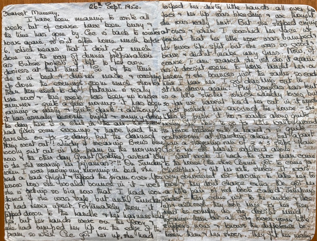 Last week I had the shoe man come to the house (the store Connie got to come for Christopher) & fit her with shoes. It was very convenient not having to take her to town & they don’t charge extra. We got her a little pair of red boots called “Jumping Jacks”– they come just to the ankle & lace up & although they look huge for her, they must be comfy as she doesn’t mind wearing them at all. She loves your little slippers now & knows the difference between them & her shoes. They fit her nicely – & go on easily now- at first she used to scrunch up her feet. On Sat. we also went to the Beamish Store- (I was quite excited – my 1st visit to a shop for so long!) & got her a little red wool cardigan (the same shape as Millie’s pink one) with white squirrels around & what with that & her red shoes & a red bow in her hair she looks very chic!! I laughed over your last letter asking if Lindy has her 8 front teeth yet & expecting her to have changed so much & yet dreaming that I could still get into your orange dress! I am the one who has changed much more than Lindy- the back of a bus that’s me! I go to the Dr. on Monday again – I will be going to the Civic Hospital & he arranged all that. Phyl Douglas is due any day now. I planned to take Linda to Dr. W. this month but he is on holiday so will wait till next month- I give her an egg for breakfast now! I haven’t been to the dentist yet- next month!