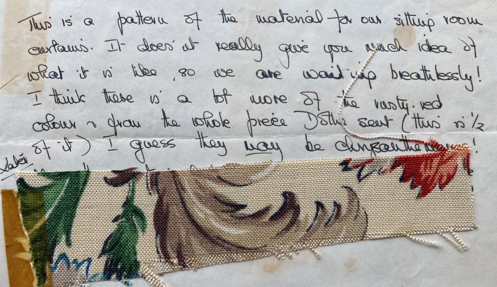 It is now Friday, 24th & my how the time flies! I got your 2 A.M.’s (No.s 1 & 2) yesterday – thank you so much for them & I was so glad to know that you had at last got some mail from me. When you were worried & kept writing & writing that no letters had come, I knew I had written quite a few & that they must turn up eventually. That reminds me, a letter arrived for you from your dumb bank in St. V. the other day (statement I suppose) so I will enclose it in one I am going to send via sea with Ruth’s letter & also patterns of my various purchases of materials, so that you can see what they are like. Also, a pattern for our sitting room curtains! Yes, I had a fat letter from Dottie last week with various patterns & we chose one & I wrote back at once & asked her to get it. We are a little bit disappointed because we asked for a gay floral-type material with a cream ground & Dottie tells us that the good heavy materials are mostly plain or self-patterned or at most 2 colours, so we have had to end in getting a cheaper material (7/11 yd.) and will have to line them. Dottie sent 4 patterns- 1. Heavy thick linen, (we liked the material) but it was a dull muddy background & it had a pattern of herbaceous border type flowers, but also dull & muddy looking- the whole very conventional & rather country Vicarage-ish!! 2. A pinky-puce flowered material with green leaves, on a gray & white background – Dottie was keen on this, but not us – we wanted cream not white & don’t care for the pucey-pink 3. kind of conventional squared pattern on cream with bright pinks, blues, greens, browns – neither of us liked it & 4. the one we chose- a cream ground with bricky red flowers, (chrysanthemums?) green leaves & a few blue flowers – As far as we can tell from the pattern it looks nice – the red & blue go with the Indian rug & the green with the end wall, which I think is pretty good & later on we plan to get the puce sofa & arm chair covered – they definitely aren’t in our colour scheme & we only bought them because they were a bargain in spite of the colour! They are good & solid & v. comfy too.