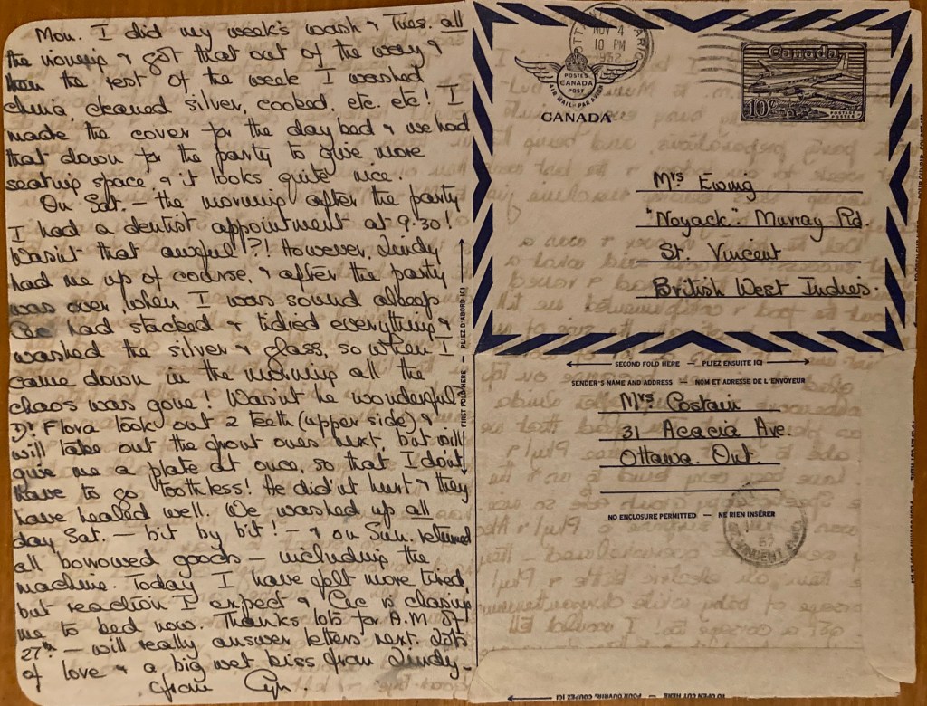 On Sat.- the morning after the party I had a dentist appointment at 9:30! Wasn’t that awful?! However, Lindy had me up of course, & after the party was over, when I was sound asleep Cec had stacked & tidied everything & washed the silver & glass, so when I came down in the morning all the chaos was gone! Wasn’t he wonderful? Dr. Flora took out 2 teeth (upper side) & will take out the front ones next, but will give me a plate at once, so that I don’t have to go toothless! He didn’t hurt & they have healed well. We washed up all day Sat.- bit by bit! – & on Sun. returned all borrowed goods – including the machine. Today I have felt more tired, but reaction I expect & Cec is chasing me to bed now. Thanks lots for A.M. of 27th- will really answer letters next. Lots of love & a big wet kiss from Lindy-