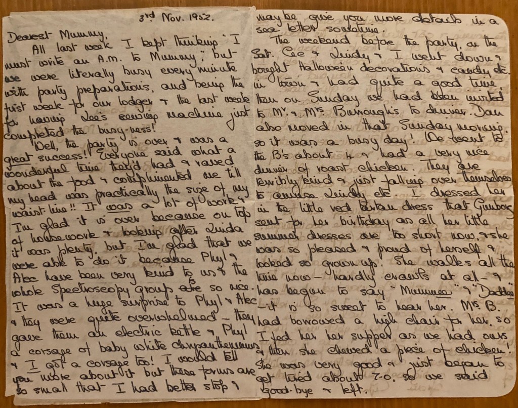 Well, the party is over & was a great success! Everyone said what a wonderful time they had & raved about the food & complimented me till my head was practically the size of my waist-line!! It was a lot of work & I’m glad it is over because on top of housework & looking after Linda it was plenty, but I’m glad that we were able to do it because Phyl & Alec have been very kind to us & the whole Spectroscopy group is so nice. It was a huge surprise to Phyl & Alec & they were quite overwhelmed – they gave them an electric kettle & Phyl a corsage of baby white chrysanthemums & I got a corsage too! I would tell you more about it but these forms are so small that I had better stop & maybe give you more details in a sea letter sometime.