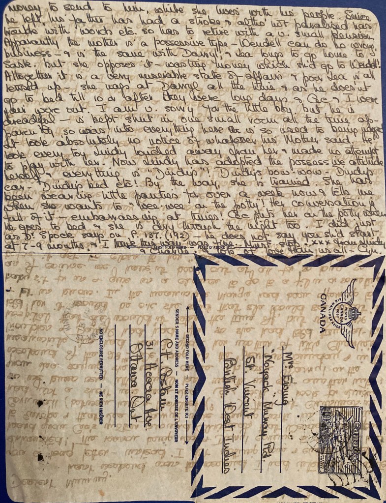 In the meanwhile Margie had been offering to baby sit for us & give us a chance to go to a film or something as of course we haven’t been out at all for so long, so before it got too close to her “date” we arranged for her to come on Friday [which was the 27th Feb.] & we were going to see a British film “Breaking the Sound Barrier”. I was quite excited about it as I hadn’t seen a film since about October I think- and then! We had just finished dinner & in walked Lea & Darryl! I could literally have howled & wept! Apart from not letting us know she’d said the 28th in the first place & as well as being so disappointed I had an absolutely bare cupboard! I was going to do a big shopping on Sat. & had only about four eggs & no bacon even, let alone anything else. Cec went down to the corner store & got bacon & I phoned Margie to cancel the arrangements & of course we got organized gradually, but it was a shock to my system! We opened out the day bed (which we bought when we bought the desk etc. after you left & I re-covered) in “your” little room, which I had fortunately cleaned & tidied last week (it has been a junk room since we fixed up Dan’s) & they slept there. I felt very sorry for Lea – she is in a very bad state of nerves with continual headaches etc. & is working full-time at the Hospital. Wendell is in Italy, leaving her with debts to pay off & money to send to him, while she lives with his people. Since he left, his father has had a stroke & although not paralyzed has trouble with words etc. so has to retire with a v. small pension. Apparently the mother is a possessive type- Wendell can do no wrong, business – & is the same with Darryl, & Lea longs to go home to Sask. but she opposes it- wasting money which sh’ld go to Wendell! Altogether it is a very miserable state of affairs & poor Lea is all tensed up – she nags at Darryl all the time & as he doesn’t go to bed till 10 or after they were long days & Cec & I were fair wore out. I am very sorry for the little boy, but he is dreadful- is kept shut in one small room all the time apparently, so was into everything here & is so used to being nagged at took absolutely no notice of whatever his Mother said. He took every toy Lindy touched away from her & made no attempt to play with her. Now Lindy has adopted the possessive attitude herself & everything is “Dindy’s”! Dindy’s bow-wow – Dindy’s car – Dindy’s bed etc.! By the way, she is trained. She has been wearing little panties for over a week now & tells me when she wants to “wee-wee on the potty”! Her conversation is full of it- embarrassing at times! Cec puts her on the potty when he goes to bed & she is dry through the night too. I did just as Dr. Spock says on p. 137 (192)- he does not say you sh’d start at 7- 9 months, & I think this way was fine. Must stop xxx from Lindy & Charlie & lots of love from us all- Cyn.