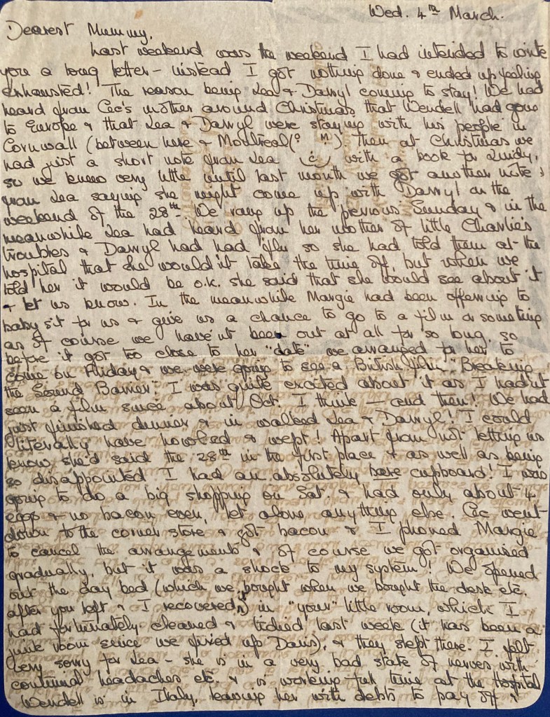Last weekend was the weekend I had intended to write you a long letter- instead I got nothing done & ended up feeling exhausted! The reason being Lea & Darryl coming to stay! We had heard from Cec’s mother around Christmas that Wendell had gone to Europe & Lea & Darryl were staying with his people in Cornwall (between here & Montreal). Then at Christmas we had just a short note from Lea with a book for Lindy, so we knew very little until last month we got another note from Lea saying she might come up with Darryl on the weekend of the 28th. We rang up the previous Sunday & in the meanwhile Lea had heard from her mother of little Charlie’s troubles & Darryl had had ‘flu so she had told them at the hospital that she wouldn’t take the time off, but when we told her it would be o.k. she said that she would see about it & let us know.