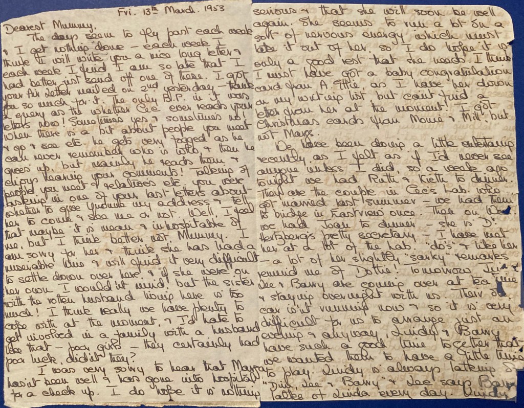 The days seem to fly past each week & I get nothing done – each week I think I will write you a nice long letter & each week I find I am so late that I had better just send off one of these. I got your Air Letter mailed on the 2nd yesterday- thank you so much for it. The only B.P. in it was a query as to whether Cec ever reads your letters now! Sometimes yes & sometimes no! When there is a bit about people you meet & go & see etc. he gets very fogged as he can never remember who is who, & then he gives up, but mainly he reads them & enjoys hearing your comments! Talking of people you meet & relatives etc. you were asking in one of your last letters about whether to give Yvonne my address & tell her to come & see me or not. Well, I feel that maybe it is mean & inhospitable of me, but I think better not, Mummy. I am sorry for her & think she has had a miserable time & will find it very difficult to settle down over here, & if she were on her own I wouldn’t mind, but the sister with the rotten husband living here is too much! I think really we have plenty to cope with at the moment, & I’d hate to get involved in a family with a husband like that- poor girls- they certainly had poor luck, didn’t they?