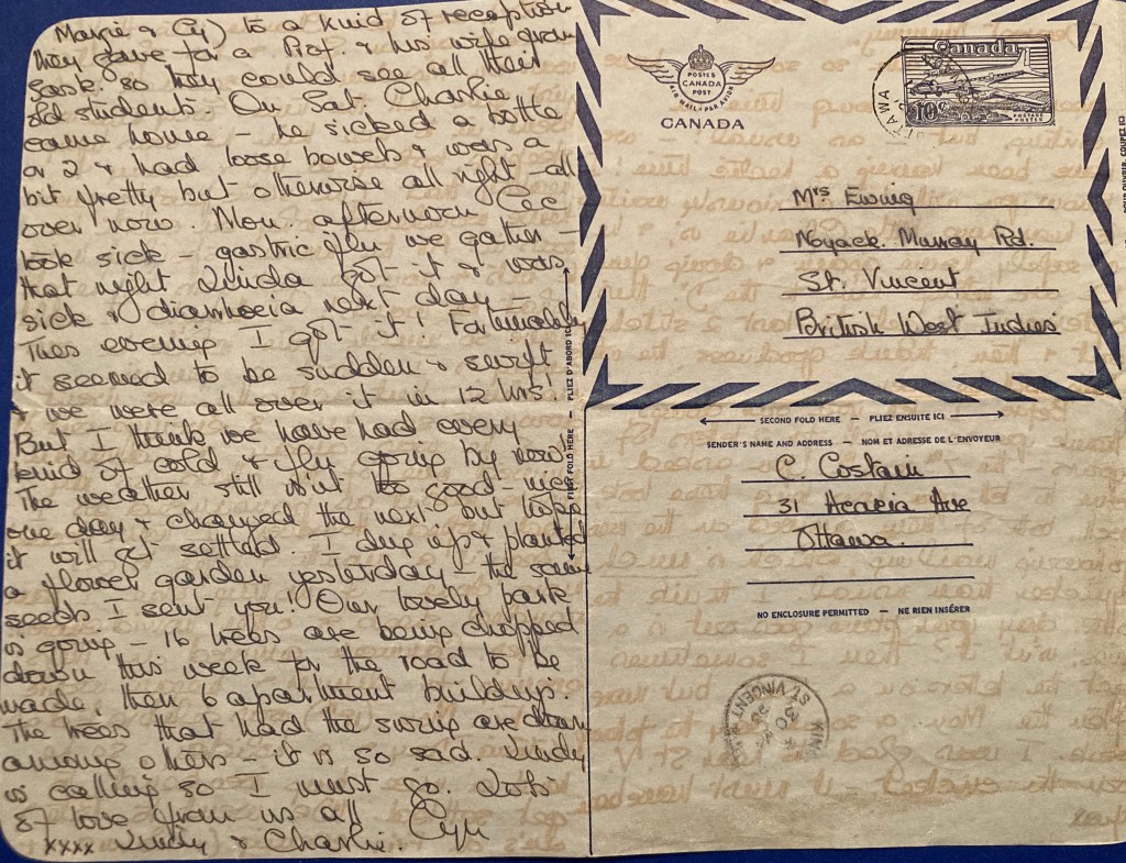 Before I tell you our doings, thank you so much for two letters of yours – the 7th & the 14th- You asked in one to tell you how long these took, well, both of them arrived on the Tues. following mailing, which is much quicker than usual. I think the other day your plane goes out is a Tues., isn’t it? Then I sometimes get the letters on a Sat. but more often the Mon. or some day the following week. I was glad to hear St.Vincent won the cricket- it must have been fun.
