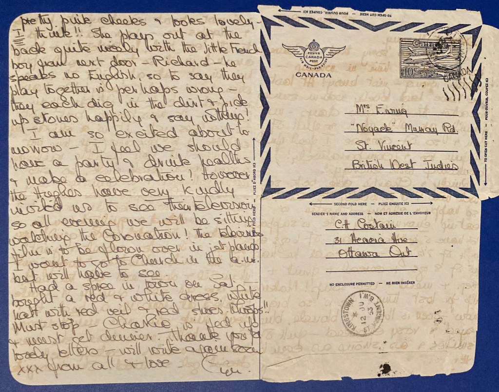 I am so excited about tomorrow – I feel we should have a party & drink healths & make a celebration! However, the Hughes have very kindly invited us to see their television so all evening we will be sitting watching the Coronation! The television film is to be flown over in jet planes! I want to go to church in the a.m. but will have to see.
