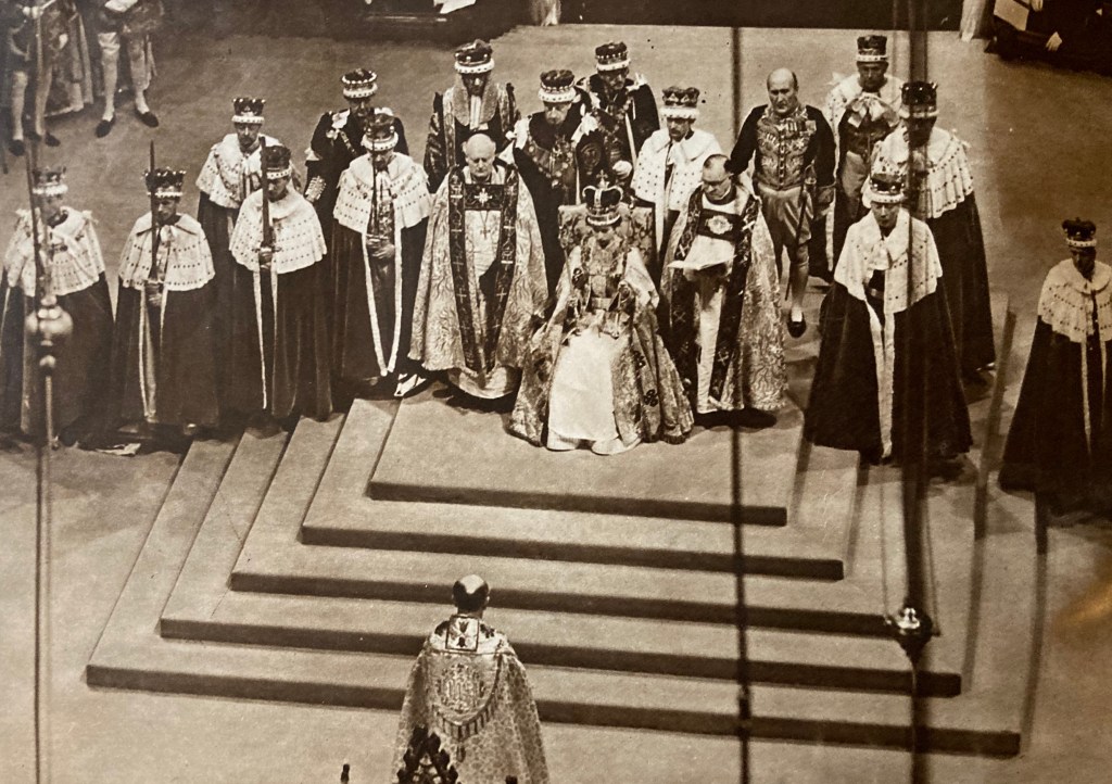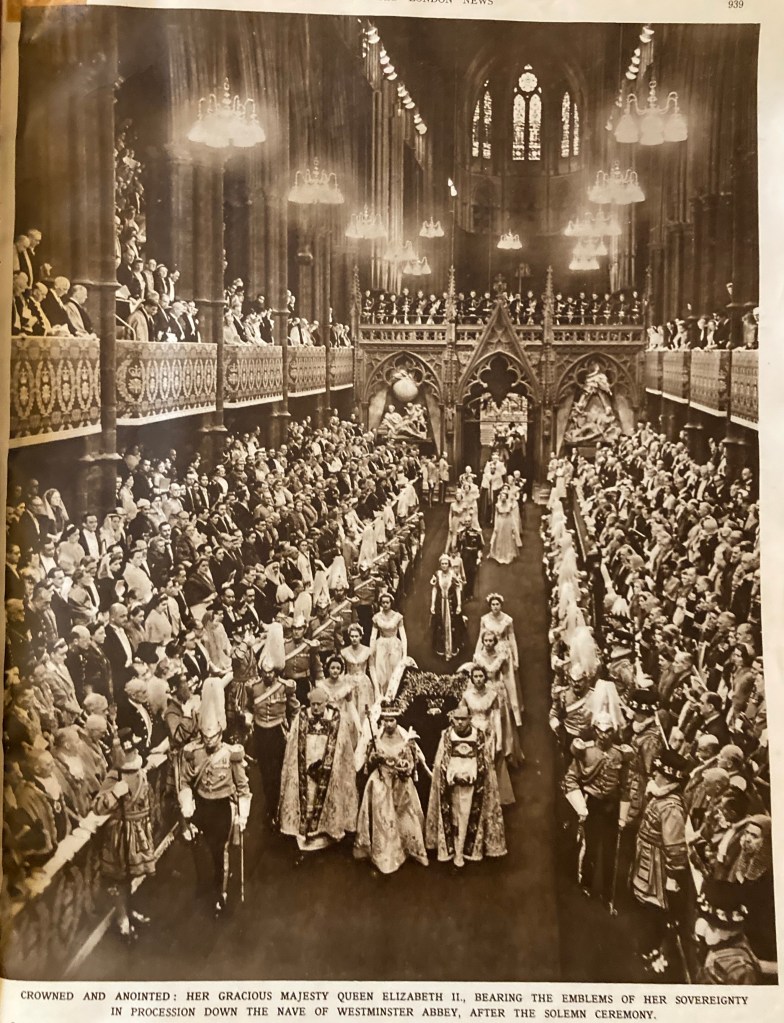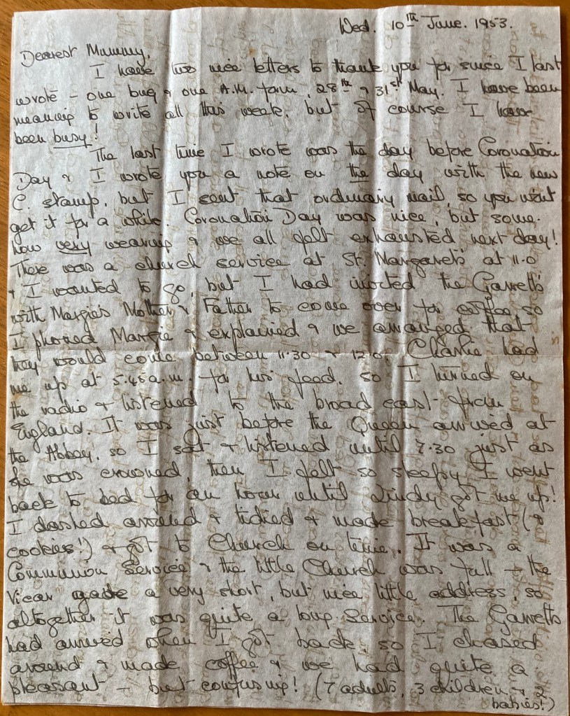 The last time I wrote was the day before Coronation Day & I wrote you a note on the day with the new C. stamp, but I sent that ordinary mail, so you won’t get it for a while. Coronation Day was nice, but somehow very wearing & we all felt exhausted next day! There was a church service at St. Margaret’s at 11:00 & I wanted to go, but I had invited the Garretts with Margie’s Mother & Father to come over for coffee, so I phoned Margie & explained & we arranged that they would come between 11:30 & 12. Charlie had me up at 5:45 a.m. for his feed, so I turned on the radio & listened to the broadcast from England. It was just before the Queen arrived at the Abbey, so I sat & listened until 7:30 just as she was crowned, then I felt so sleepy I went back to bed for an hour until Lindy got me up! I dashed around & tidied & made breakfast (& cookies!) & got to Church on time. It was a Communion Service & the little Church was full- the Vicar gave a very short, but nice little address, so altogether it was quite a long Service. The Garretts had arrived when I got back, so I chased around & made coffee & we had quite a pleasant – but confusing! (7 adults, 3 children & 2 babies) little visit! After they left we had a sandwich & at 2:00 we listened to the round-the-world broadcast & then Churchill & the Queen. There was a big procession & display etc. in town & the Queen’s speech broadcast in the Square & just after was a big Air display, so we just went out on our front grass & saw the planes going over – the climax was a group of jets flying a perfect E II in formation & they were excellent. I then went in to do all the washing up & get dinner ready & had just begun when Mrs. Hughes called me to come in for a moment- the television had begun & the Queen was on & looked lovely, so I went in & they had quite a few neighbours in. Cec & Carmen took it in turns to come in & I sat & waited & waited to see the Queen – saw all the other people going into the Abbey etc., but of course she didn’t appear for ages & then just as she did, I realized Carman had come for Cec & I went too & found it was 6 o’clock & both my children crying, poor little things! After we finally fed them & got them to bed & had dinner & drank the Queen’s health & washed up at last! Carman & I went back to the Hughes’ & saw more of the television- there had been a delay in a part of it arriving, so they were showing it over & we saw the Crowning & the remainder of the whole ceremony which was just what I wanted to see.