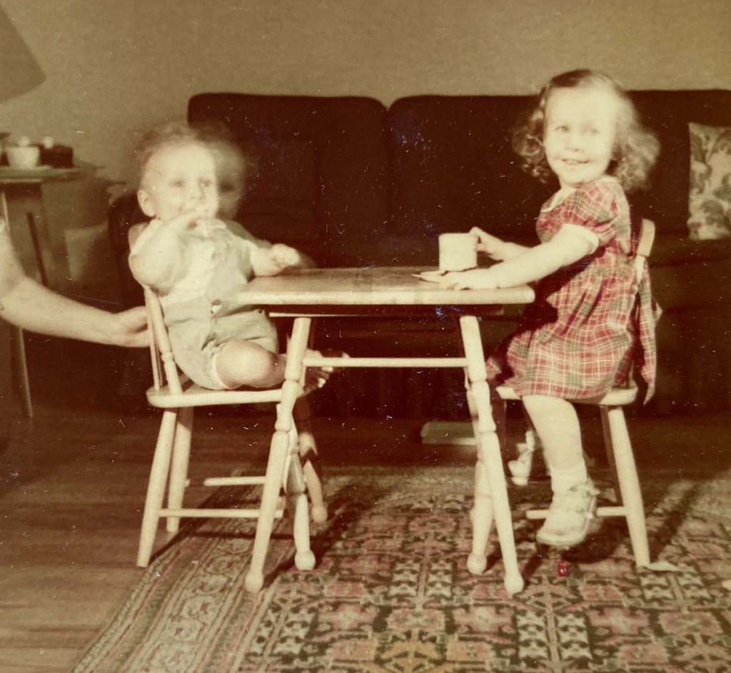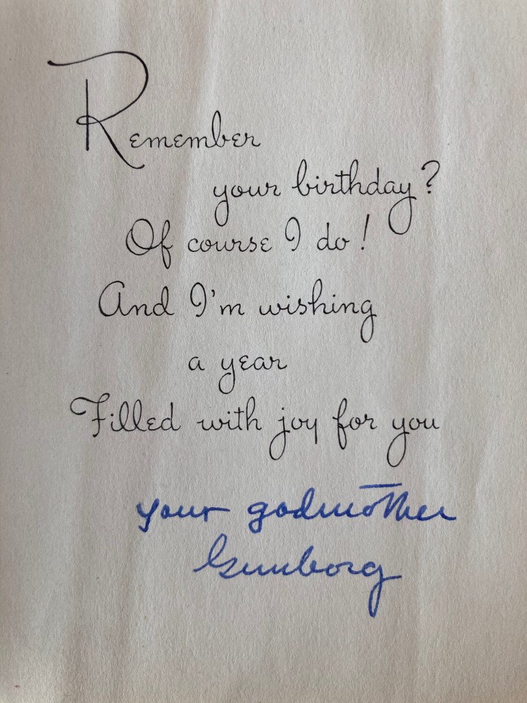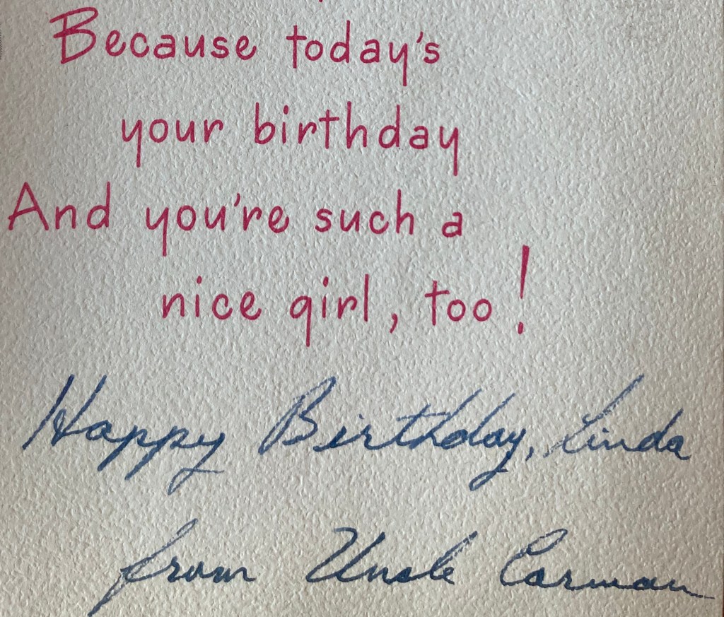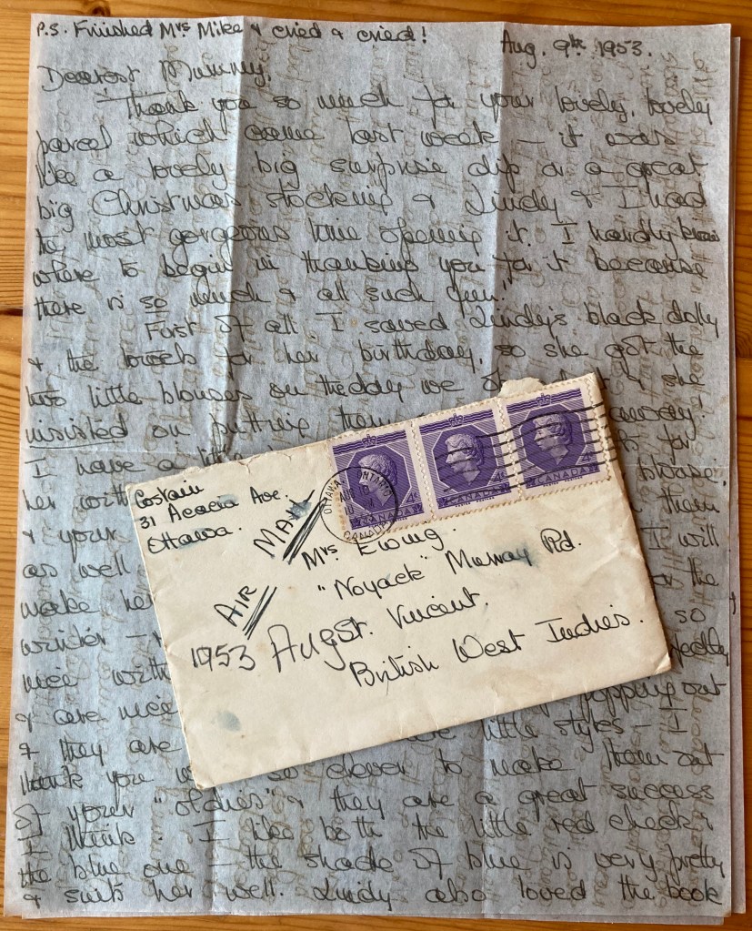The towels are known as “Lindy’s very own towels” & she has one in the bathroom now – they are sweet, Mummy & she loves having her own things. The tiny wee straw hat & purse are so sweet- I also gave her a wee tiny dolly and a little wicker pram (25¢!) (made a mattress, pillow & blanket for it) & the hat & purse just fit the dolly! Amy’s parcel had also come with a very pretty little blue & mauve lawn dress for Lindy (with pants) & cloth book for Charlie. Also their christening present for Charlie – a really lovely napkin ring with his initials & the coronation hallmark & Queen’s head! My high chair to Ruth was evidently a lapalooza so I don’t feel overwhelmed! By the way, Amy asked me to send her last letter on & I will, by sea, but the reason was that her mother had a Coronary thrombosis & was taken into “The Green” & died very quietly a few days later.