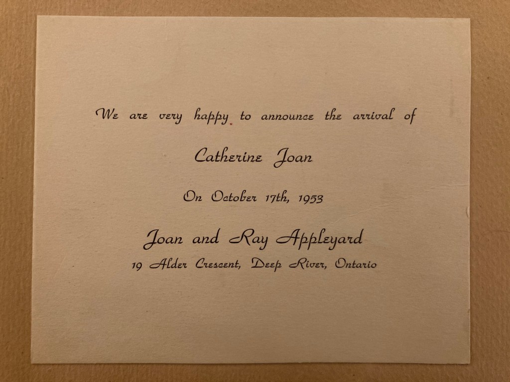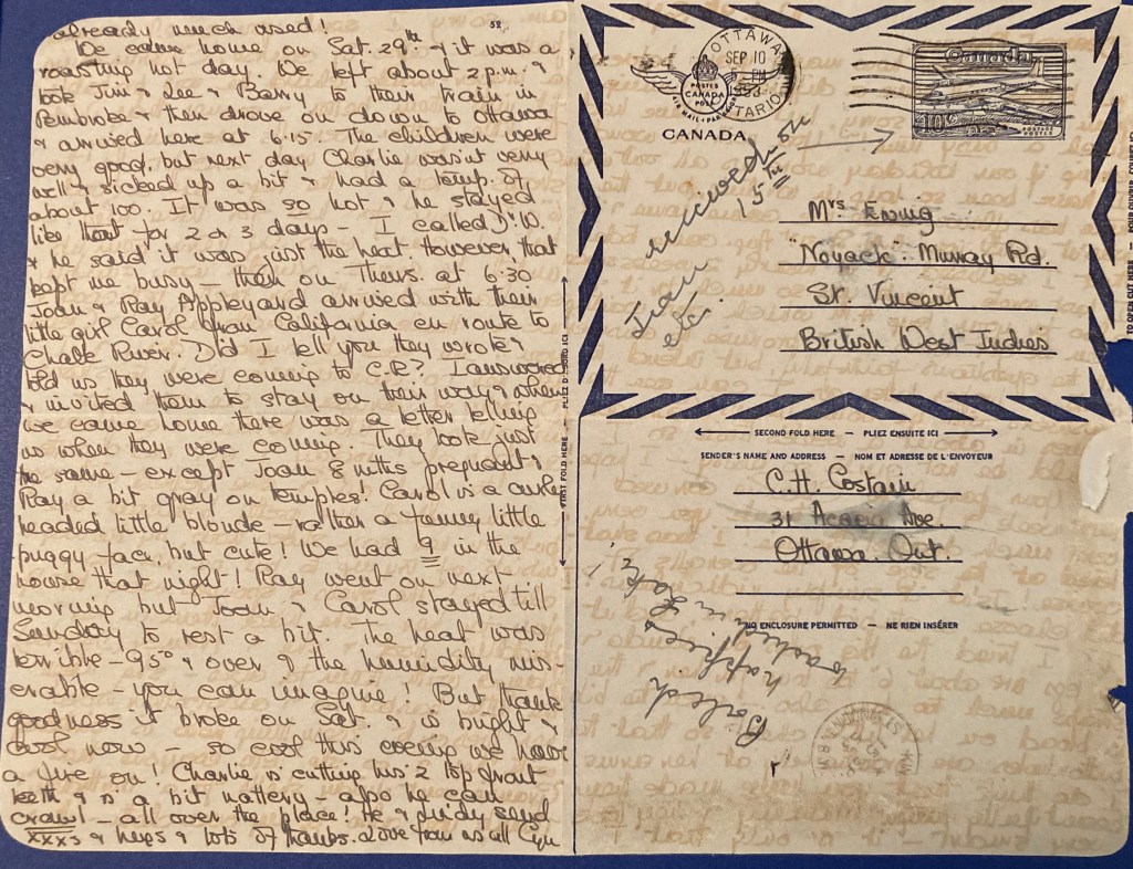 We came home on Sat. 29th & it was a roasting hot day. We left about 2 p.m. & took Jim & Lee & Barry to their train in Pembroke & then drove on down to Ottawa & arrived here at 6:15. The children were very good, but next day Charlie wasn’t very well & sicked up a bit & had a temp of about 100. It was so hot & he stayed like that for 2 or 3 days – I called Dr. W. & he said it was just the heat. However that kept me busy- then on Thursday at 6:30 Joan & Ray Appleyard arrived with their little girl Carol from California en route to Chalk River. Did I tell you they wrote & told us they were coming to C.R.? I answered & invited them to stay on their way & when we came home there was a letter telling us when they were coming. They look just the same- except Joan 8 months pregnant & Ray a bit gray on temples! Carol is a curly headed little blonde- rather a funny little puggy face, but cute! We had 9 in the house that night! Ray went on next morning but Joan & Carol stayed till Sunday to rest a bit. The heat was terrible – 95° & over & humidity miserable – you can imagine! But thank goodness it broke on Sat. & is bright & cool now- so cool this evening we have a fire on! Charlie is cutting his 2 top teeth & is a bit nattery- also he can crawl – all over the place! He & Lindy send xxxs & hugs & lots of thanks.