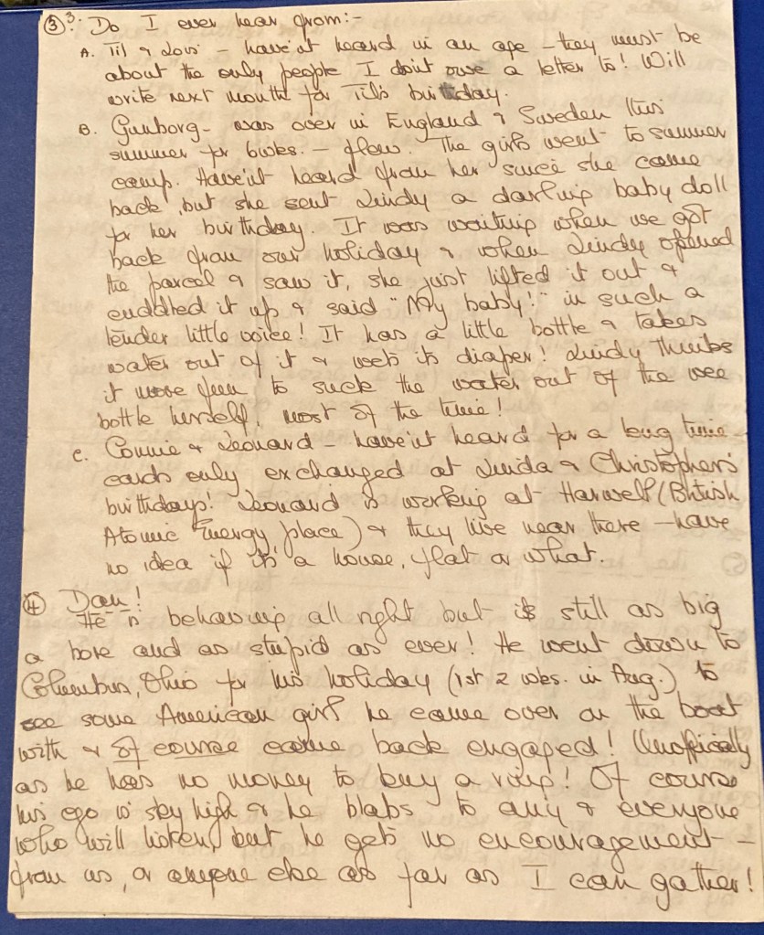 C. Connie & Leonard – haven’t heard for a long time, cards only exchanged at Linda & Christophers’ birthdays! Leonard is working at Harwell (British Atomic Energy place) & they live near there – have no idea if it’s a house, flat or what.