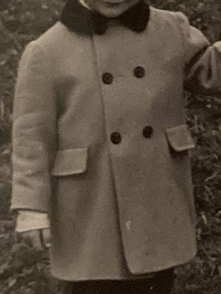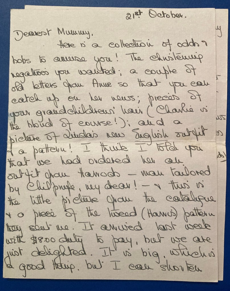 Here is a collection of odds & bobs to amuse you! The christening negatives you wanted; a couple of old letters from Anne so that you can catch up on her news; pieces of your grandchildren’s hair (Charlie is the blonde of course!); and a picture of Linda’s new English outfit & a pattern! I think I told you that we had ordered her an outfit from Harrods- man tailored by Chilprufe, my dear! – & this is the little picture from the catalogue & a piece of the tweed (Harris) pattern they sent me.