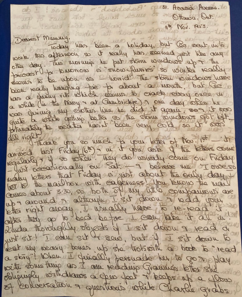 Thank you so much for your letter of Nov. 1st- it arrived last Friday (6th) & in it you ask if the letters come regularly & if so when. They do usually come on Friday-just occasionally on Sat. – & believe me, I owe so many letters that Friday is just about the only day I trot to the mailbox with eagerness! You know the mail comes about 3:30, so both of my little companions are up & around & although I sit down & read your letter right away, I usually have to re-read it after they go to bed before I can take it all in! Linda thoroughly objects if I sit down & read or just sit! I can sit & sew, but if I sit down to rest my weary bones up she trots with a book to “read a story”! When I finally persuade her to go & play with something as I am reading Grannie’s letter she obligingly withdraws a few feet & keeps up a flow of conversation & questions while Charlie grabs at the paper & says “Ba-bab-bab” & likewise! I do enjoy your letters so much though – both news of you & all the relatives & even people I don’t know! – also chit-chat & questions about the babies etc. I am never bored – far from it – & I am just sorry that I haven’t told you more often how much I look forward to them, but each letter I write seems to be scribbled in such a hurry. I think back to the “old days” when I used to ensconce myself on the sofa on a Sunday afternoon & write 8 or 9 letters in a go & although I sometimes wish I could have an uninterrupted day at letter-writing, I still wouldn’t change! When the children are asleep in the afternoon I very often finish off washing or ironing & get dinner ready so that when they wake up I can take them out, then in the evening by the time they’re in bed & dishes washed I really collapse & it takes such willpower to get my writing things out! To you, I can usually babble on effortlessly, but to other people I just sit & try to write & gaze blankly & get nowhere!