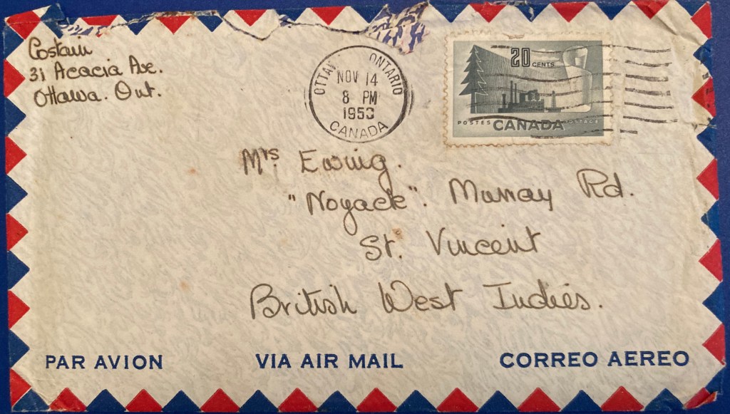 About my clothes – as I said, I don’t plan to get much & really now the children are small I go out so little that I feel there is no absolute necessity. Thank you so much for your offer to finance a coat or a dress for me from Harrod’s but I’m not going to take you up on it. I still have about £80 in England & could easily get myself some things sent if I wanted, but as you know I never could get clothes to fit me in England & I feel it would be just hopeless to have to try alterations myself. A coat or suit would be impossible & even a dress, when I think of all the taking in on the shoulders & lifting waistline etc. etc. which I always used to have to get done, I just shudder. Harrod’s send me their little catalogue once in a while but although their things look nice it seems far too much of a risk & then there is always duty to pay this end & no chance of returning the things if you don’t like them. I would far rather wait & maybe you could make me or have made for me a couple of cotton dresses in the summer – it shouldn’t be too difficult because I must be pretty much the same size as you now – bustier though!! I hope to get a new dress around Christmas or after, and as for the coat, my red one is still not too bad after cleaning & it’s nice & warm so I don’t care – after all, the only places I go to during the day are to the Grocery store or Mr. Dube’s post office, so I don’t need to look very elegant! In the evening if we go to people’s houses we always go in the car & so I don’t feel I really need a new coat.