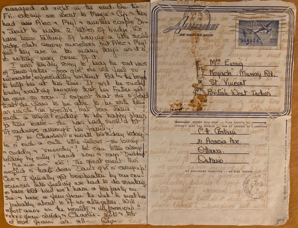 It is Charlie’s 11 month birthday today – he is such a cute little fellow – so loving & cuddly & “smoochy”! He can totter along holding by only 1 hand now & says “Daddad” & “Ma ma ma” etc. The great event this weekend is that dear Dan’s girl is coming up! Cec & I finally got browbeaten by our consciences into feeling we had to do something, so have told him we’ll have a tea party on Sun. & have a few from the Lab. to meet her – probably about 10 of us altogether. Will report anon on the results & impressions!! xxxxs from Lindy & Charlie – Lots & lots of love from us all – Cyn.