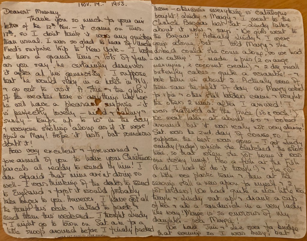 Thank you so much for your air letter of the 12th Nov.- it came on Tues. 17th, so I don’t think it was any quicker than usual. I was so glad to hear of Uncle Fred’s surprise trip to New York – I hope he has a grand time & lots of fun – as you say, he certainly deserves it after all his generosity. I suppose that he would stay in a hotel in N.Y. & go out to visit A. Ettie & the girls. If the weather there is anything like here he will have a pleasant surprise – it is perfectly lovely- mild & balmy & sunny – temps. up to 60° in the day & everyone strolling along as if it were April or May! Hope it lasts, but somehow doubt it!