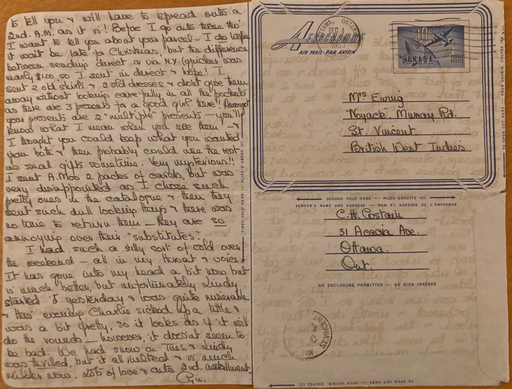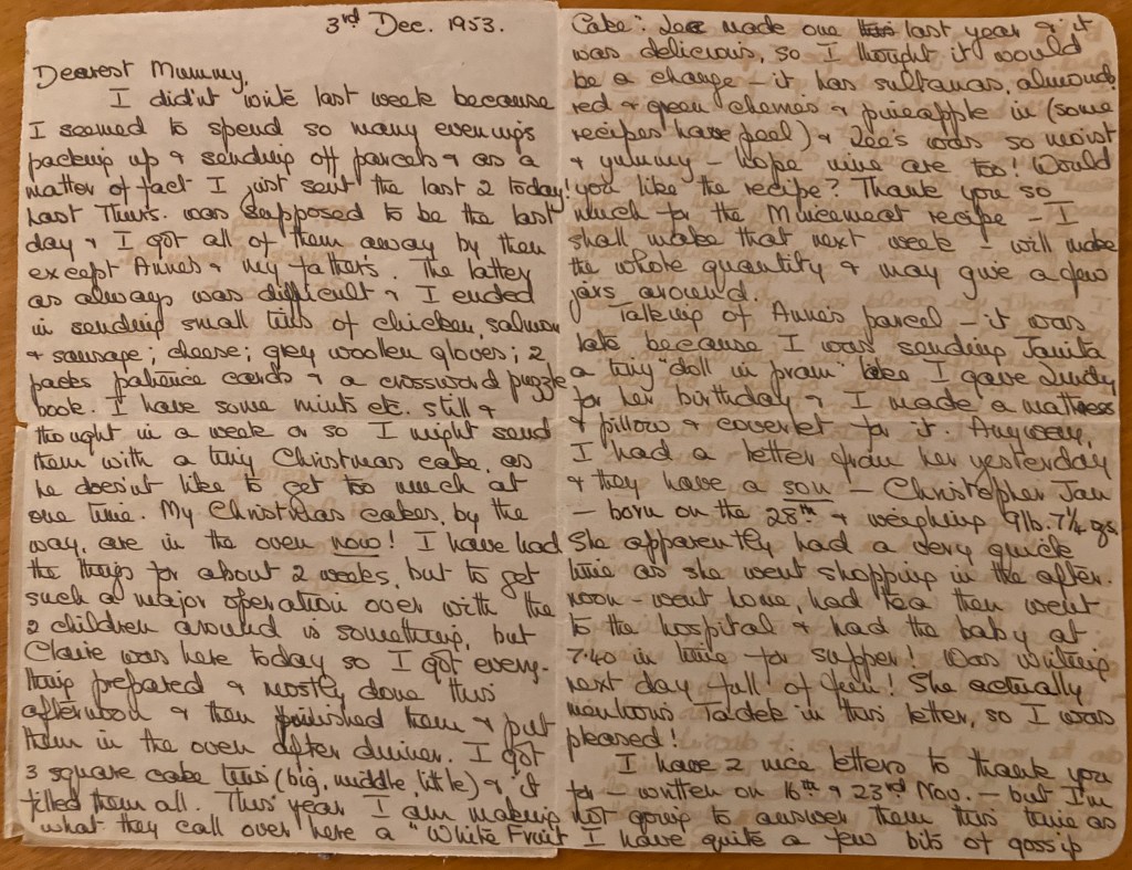 I have 2 nice letters to thank you for- written on 16th & 23rd Nov.- but I’m not going to answer them this time as I have quite a few bits of gossip to tell you & will have to spread onto a second A.M. as it is! Before I go onto those tho’ I want to tell you about your parcel – I do hope it won’t be late for Christmas, but the difference between sending direct or via N. Y. (quicker was nearly $1.00, so I sent in direct & hope! I sent 2 old shirts & 2 old dresses & don’t give them away without looking carefully in all the pockets as there are 3 presents for a good girl there! Amongst your presents are 2 “multiple” presents – you’ll know what I mean when you see them– & I thought you could keep what you wanted from both & then probably could use the rest as small gifts sometime. Very mysterious!! I sent A. Moo 2 packs of cards, but was very disappointed as I chose such pretty ones in the catalogue & then they sent such dull looking things & there was no time to return them – they are so annoying over their “substitutes”.