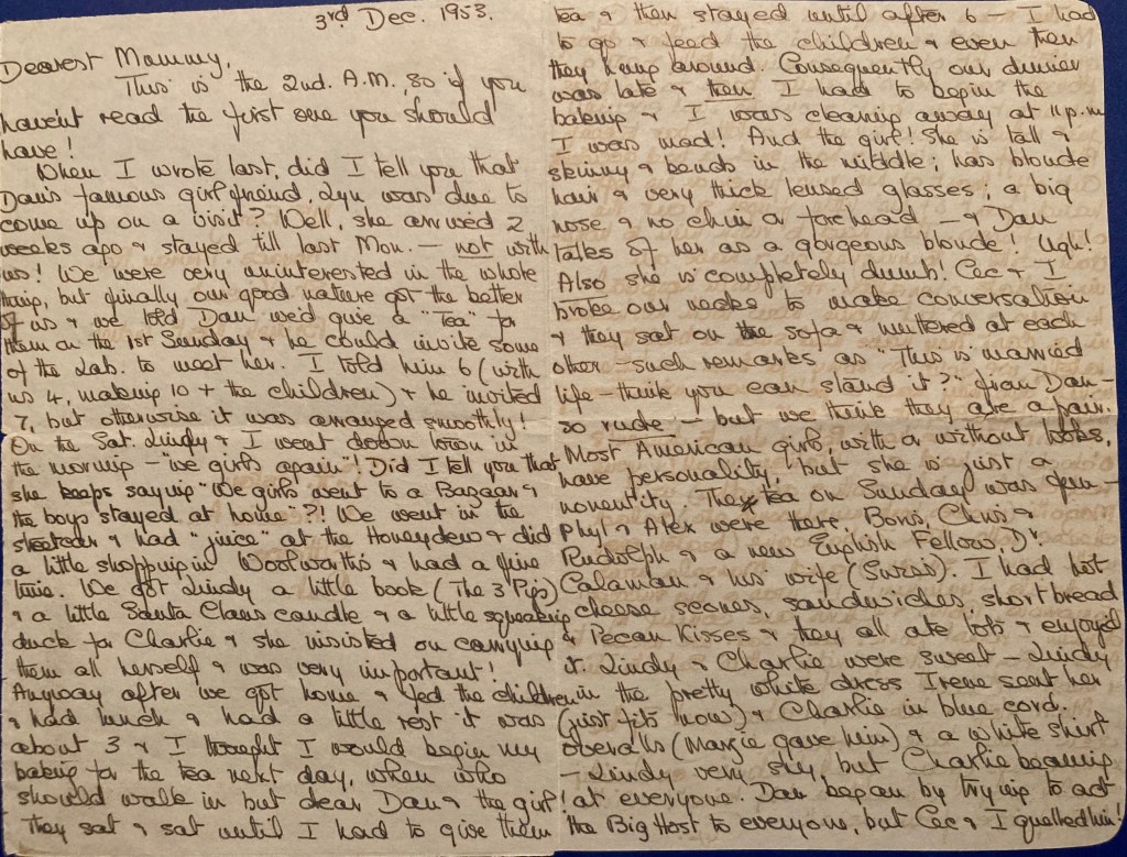 When I last wrote last, did I tell you that Dan’s famous girlfriend, Lyn was due to come up on a visit? Well, she arrived 2 weeks ago & stayed till last Mon. – not with us! We were very uninterested in the whole thing, but finally our good nature got the better of us & we told Dan we’d give a “Tea” for them on the 1st Sunday & he could invite some of the Lab. to meet her. I told him 6 (with us 4 making 10 + the children) and he invited 7 but otherwise it was arranged smoothly!
