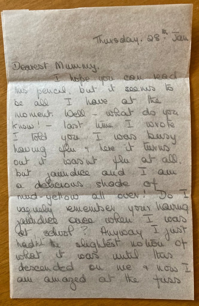 I hope you can read this pencil, but it seems to be all I have at the moment. Well – what do you know- last time I wrote I told you I was busy having flu & here it turns out it wasn’t flu at all, but jaundice and I am a delicious shade of mud yellow all over! Do I vaguely remember your having jaundice once when I was at school? Anyway I just hadn’t the slightest notion of what it was until this descended on me & now I am amazed the fuss over it.