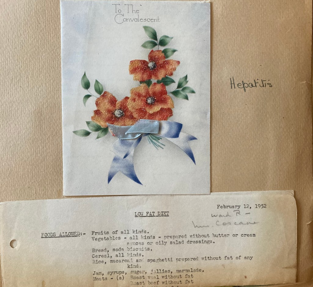As you can imagine I nearly fell over in a fit, particularly as he went on to say that he thought the best thing for all of us would be for me to go into hospital for the three weeks. I had no idea that jaundice was so serious, but he says that if it’s not taken care of it becomes a chronic liver complaint & you’re always tired & get thinner & thinner (already have lost 10 lbs. in a week- whoops!) & you end up with a hobnail liver. Imagine – a hobnail liver without ever having had the whiskey first!! Anyway he told me all about it & we discussed finance & looking after the children etc. & he told me to go home & talk it over with Cec, which I did. Altogether we decided that I had better come into the hospital so as to get the care & also relieve him of trying to look after an invalid at home & he is staying at home looking after the children. I called Claire and asked her to come in as much as she could & she was coming Wed. & Thurs. of this week, so Cec will be able to go into the Lab. a bit & he is going to try to go in at night as Douglases & Garretts etc. all say they will baby sit. One thing about the hospital business is that our Insurance will pay for quite a bit of it, so that is a relief, as we no sooner seem to be getting on nicely & saving a little money when something happens to upset it all. There was no bed in the hospital till Tuesday afternoon, so Cec brought me in about 4, & Phyl stayed with the children who were asleep. The biggest blight of the whole thing is that I have been put in the Contagious Ward, as apparently jaundice is infectious & I am allowed no visitors or anything. Cec can come & visit me once only the whole time I’m here, so I feel very isolated, & keep wondering what my little family is doing. I have a small room to myself with a big window & quite a nice view & the nurses are very kind & attentive. It is a new wing on the hospital so everything is very clean & new – most of the other patients are children in with chickenpox, measles etc. so they are all bedded down about 7 p.m & the ‘ush certainly is breathless! Dr. K. comes into see me every day & is very nice – he is very annoyed & upset about the no visiting business, because apparently I am not really at all infectious now, but it is the Ward Rule so must be obeyed.