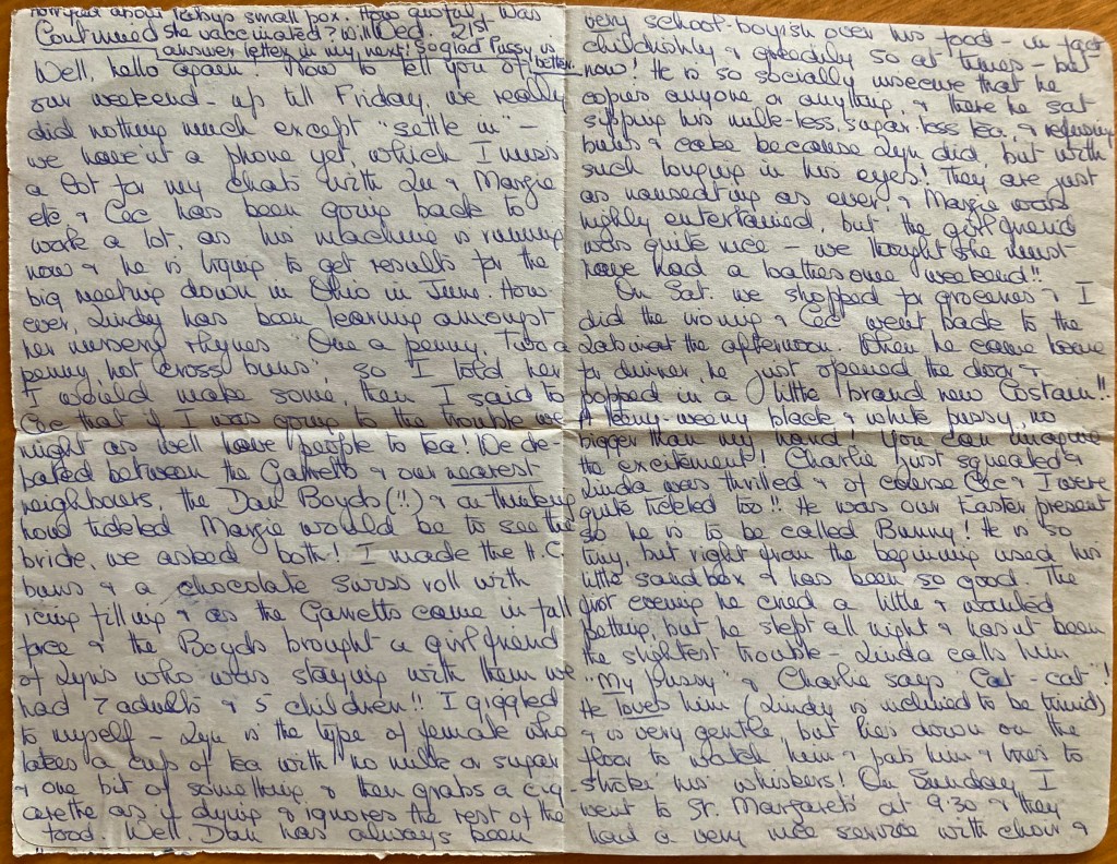 On Sat. we shopped for groceries & I did the ironing & Cec went back to the Lab in the afternoon. When he came home for dinner, he just opened the door & popped in a little brand new Costain!! A teeny – weenie black & white pussy, no bigger than my hand! You can imagine the excitement! Charlie just squealed & Linda was thrilled & of course Cec & I were quite tickled too!! He was our Easter present so he is to be called Bunny! He is so tiny, but right from the beginning he used his little sandbox & has been so good. The first evening he cried a little & wanted petting, but he slept all night & hasn’t been the slightest trouble – Linda calls him “My pussy” & Charlie says “Cat – cat”! He loves him (Lindy is inclined to be timid) & is very gentle, but lies down on the floor to watch him & pats him & tries to stroke his whiskers! On Sunday I went to Saint Margaret’s at 9:30 & they had a very nice service with choir & absolutely packed. We gave Charlie a tiny pail with a little eggs in & a wee chocolate hen on top & before we turned around he was 1/2 way through it! Linda got a wee baby pram with eggs in & she was sampling them all! I tried to write change-of-address letters & got most of them done. Feel we have been here a year already!