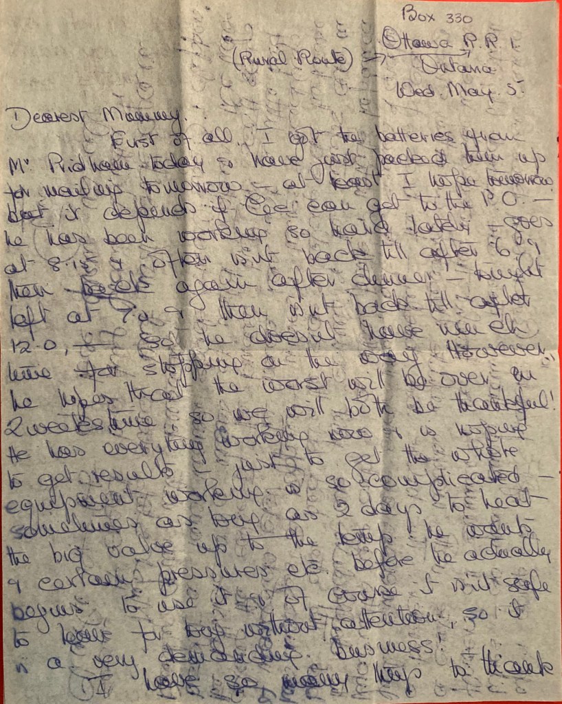 First of all, I got the batteries from Mr. Pridham today & have just packed them up for mailing tomorrow – at least I hope tomorrow but it depends if Cec can get to the P.O.- he has been working so hard lately – goes at 8:15 & often isn’t back till after 6 & then back again after dinner- tonight left at 7.0 & then isn’t back till after 12.0,- so he doesn’t have much time for stopping on the way. However, he hopes that the worst will be over in 2 weeks time, so we will both be thankful! He has everything working now & is hoping to get results – just to get the whole equipment working is so complicated – sometimes as long as 2 days to heat the big valve up to the temp. he wants & certain pressures etc. before he actually begins to use it & of course it isn’t safe to leave for long without attention, so it is a very demanding business!