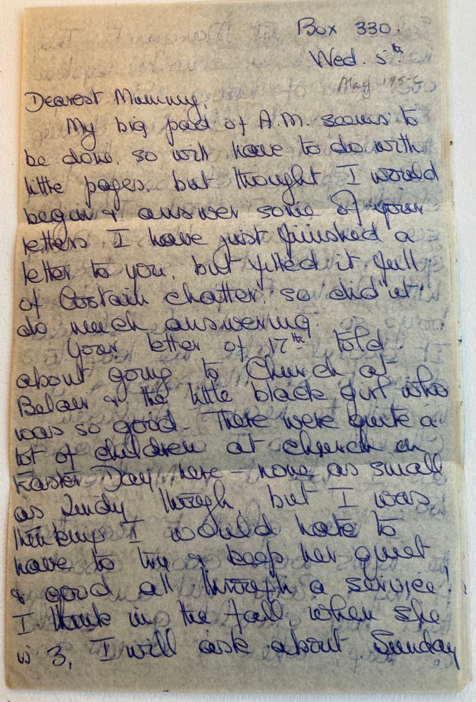Your letter of 17th told about going to Church at Belair & the little black girl who was so good. There were quite a lot of children at church on Easter Day here – none as small as Linda though, but I was thinking I would hate to have to try & keep her quiet & good all through a service! I think in the fall, when she is 3, I will ask about Sunday School at Saint Margaret’s. They have such a sensible system over here of having Sunday School for the children during the morning service, & they have special classes for tiny children, so I think I might see how Linda likes it. Barry goes & loves it & so does little Leslie Forsyth & the Garrett boys so I think she should. It doesn’t take me long to drive to Saint Margaret’s & it is still the nearest Anglican Church, so I am pleased as I like it & Mr. Stewart too.