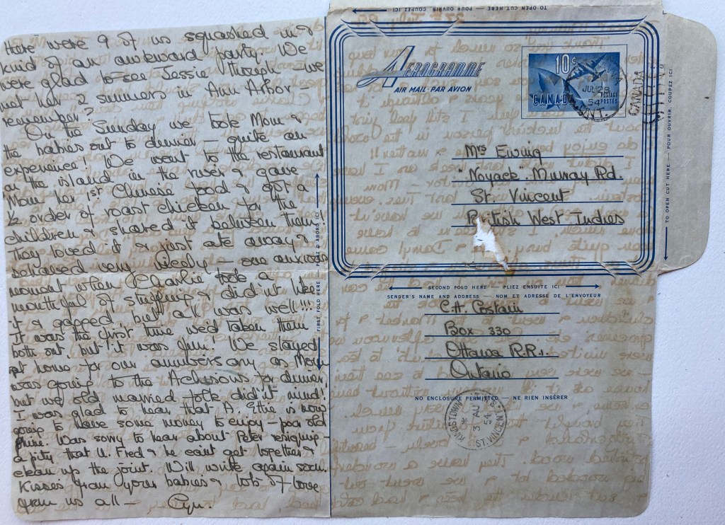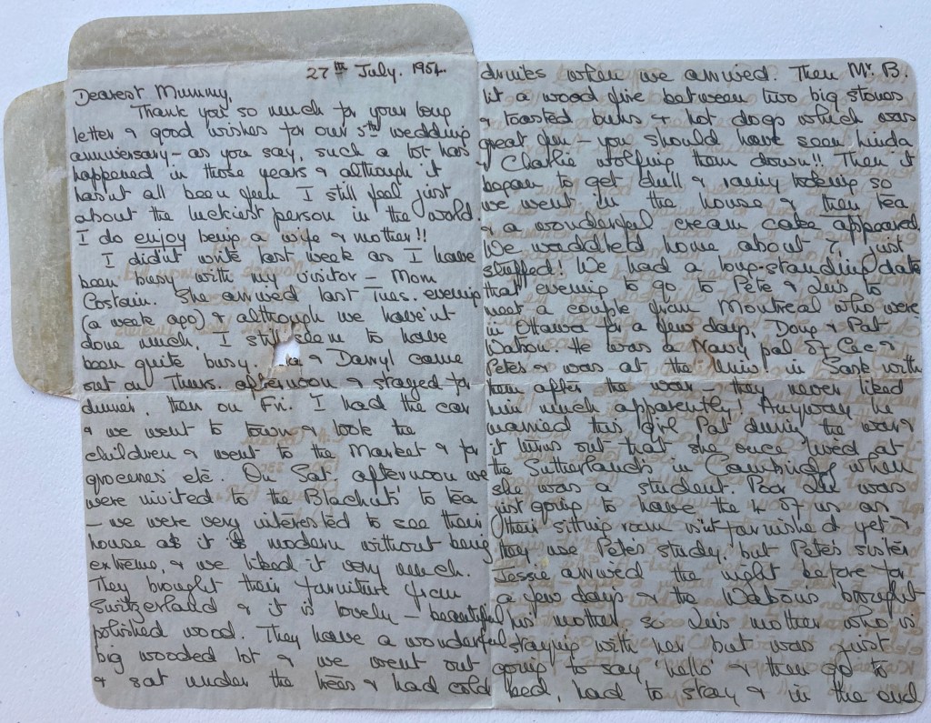 I didn’t write last week as I have been busy with my visitor – Mom Costain. She arrived last Tues. evening (a week ago) & although we haven’t done much, I still seem to have been quite busy. Lea & Darryl came out on Thurs. afternoon & stayed for dinner, then on Friday I had the car & we went to town & took the children & went to the Market & for groceries etc. On Sat. afternoon we were invited to the Blachut’s to tea- we were very interested to see their house as it is modern without being extreme, & we liked it very much. They brought their furniture from Switzerland & it is lovely- beautiful polished wood. They have a wonderful big wooded lot & we went out & sat under the trees & had cold drinks when we arrived. Then Mr. B. lit a wood fire between two big stones & toasted buns & hot dogs which was great fun – you should have seen Linda & Charlie wolfing them down!! Then it began to get dull & rainy looking so we went in the house & then tea & a wonderful cream cake appeared. We waddled home about 7, just stuffed! We had a long-standing date that evening to go to Pete & Lu’s to meet a couple from Montreal who were in Ottawa for a few days, Doug & Pat Watson. He was a Navy pal of Cec & Pete’s & was at the Univ. in Sask. with them after the war- they never liked him much apparently! Anyway he married this girl Pat during the war & it turns out that she once lived at the Sutherland’s in Cambridge when she was a student. Poor Lu was just going to have the 4 of us as their sitting room isn’t furnished yet & they use Pete’s study, but Pete’s sister Jessie arrived the night before for a few days & the Watsons brought his mother, so Lu’s mother who is staying with her but was just going to say ‘hello’ & then go to bed, had to stay & in the end there were 9 of us squashed in & kind of an awkward party. We were glad to see Jessie though – we met her 2 summers in Ann Arbour – remember?