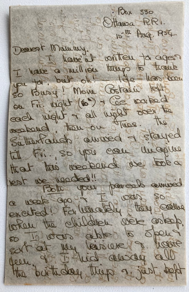 I have told you nothing about the course of events in this letter & haven’t answered one of yours, but I will try & do better next time, now that my spate of visitors is over. You were asking me about a long sea letter I said I was writing you – well I must admit that I am sorry to say it never got done! But I still plan to do it one of these days! We liked having Mom C. very much – she is a nice person, quiet but a sense of humour as you can imagine knowing her son!! She helped a lot with the children & I think liked them very much, – although she never says, you know! Lindy was fine with her & of course Charlie is friends with everyone but I think Lindy is getting over her shyness a bit now too. Anyway Mom C. told Mrs. Rothwell (who told me!) that she thought I was a very good mother!!