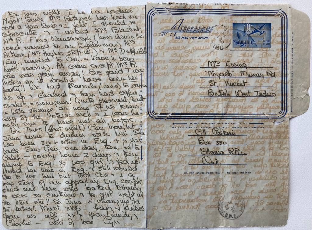 On Thurs. (last night) Cec brought June home to dinner with him. She has been 3 or 4 months in Eng. & is just back. Saw Geo. one day, then he to Calif- coming home 2 days & then flying to Eng. so poor girl is fed up! Loved her time in England & still would like to live there but told Cec & I a long story of an appalling English couple she’d met here who loathed Ottawa & were so critical & the girl wept all the time etc.!! So June is changing for the better!! Must stop – Hugs & kisses from us all – xxx from Lindy & Charlie – Lots of love – Cyn.