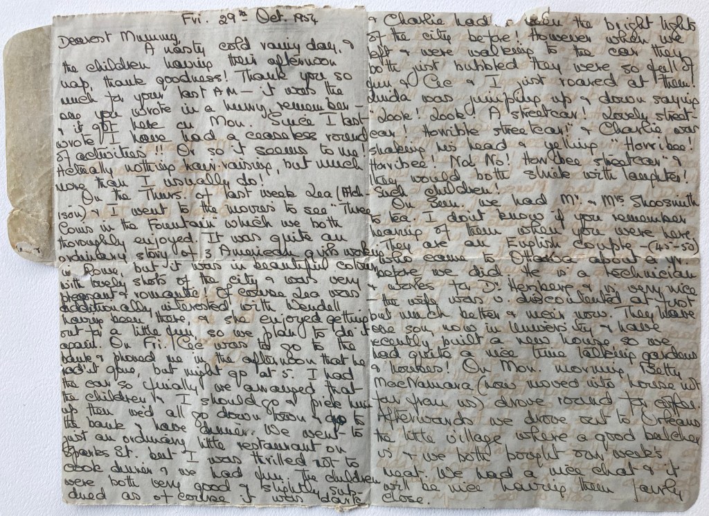 A nasty cold rainy day, & the children are having their afternoon nap, thank goodness! Thank you so much for your last A.M. – it was the one you wrote in a hurry, remember – & it got here on Mon. Since I last wrote I have had a ceaseless round of activities!! Or so it seems to me! Actually nothing hair-raising, but much more than I usually do!
