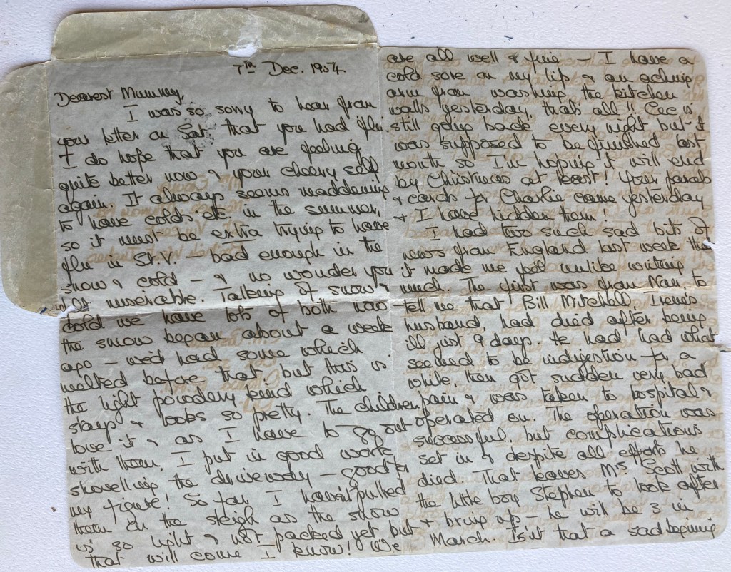 I had two such sad bits of news from England last week that made me feel unlike writing much. The first was from Nan, to tell me that Bill Mitchell, Irene’s husband, had died after being ill just 9 days. He had had what seemed to be indigestion for a while, then got sudden very bad pain & was taken to hospital & operated on. The operation was successful, but complications set in & despite all efforts he died. That leaves Mrs. Scott with the little boy Stephen to look after & bring up – he will be 3 in March. Isn’t that a sad beginning for a little fellow’s life? His own parents give him for adoption & then both his adopted ones die – one wonders how Mrs. Scott will ever manage as she was ill at one time, wasn’t she? Poor Bill and Irene – at least I’m glad for Irene that she went first.