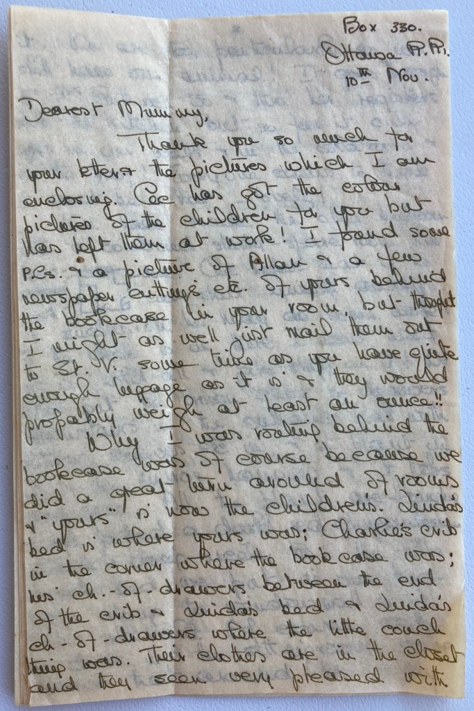 Why I was routing behind the bookcase was of course because we did a great turnaround of rooms & “yours” is now the children’s. Linda’s bed is where yours was; Charlie’s crib in the corner where the bookcase was; his ch-of-drawers between the end of the crib & Linda’s bed & Linda’s ch-of-drawers where the little couch thing was. Their clothes are in the closet and they seem very pleased with it. We are too, particularly as we still have our animal! It goes through to Mrs. Rothwell too & through her registers into the kitchen, but so far it only goes in our walls & in the cold room & in the roof! Everyone seems to think it must be a rat – lovely!