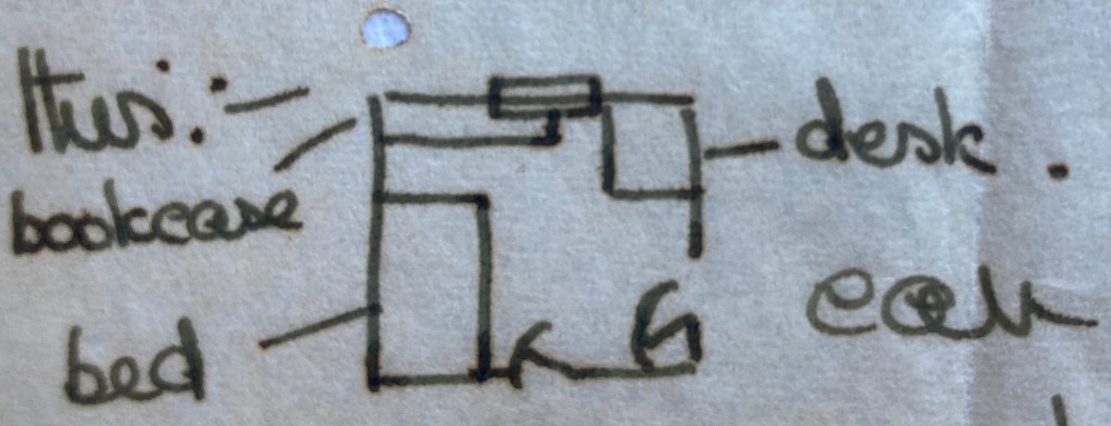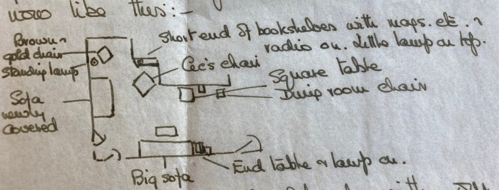 Cec hopes that if he can shut himself away in seclusion he may do some work & if the desk is in there I won’t use it as a hold-all & pile stuff on it! We have put the brown chest of drawers downstairs in the entrance hall with mittens, scarves etc. in, & a plant on it & the mirror hanging, & it looks very nice. All the plants are flourishing & we potted a dark red chrysanthemum which is doing nicely too. The little couch bed we put in our bedroom along the window wall & it looks all right. Of course with no desk in the sitting room we’ve moved that around too- my favourite occupation! – and it is now like this:-