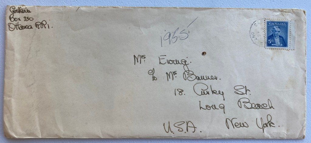 Both the children & I had bits of colds last week – nothing much, but runny noses & Linda got a cough & I think it must have affected her disposition as she is cross as two sticks this week! Anyway on Sat. to cheer me up I went to the library & then on downtown to get a new hat. I made quite a tour of Ogilvie’s, Caplan’s, Frieman’s etc. & didn’t see anything thrilling, but ended up at a little hat shop where I got quite a cute one for $6.00 – brown velvet like yours & sitting on the top of my head, but it has little brown velvet flowers at each side with a diamanté centre in each one, so it is quite frivolous. Cec approves & I am tickled to bits. On Sunday however, I decided we shouldn’t go to Sunday School as we were both coldy so I haven’t worn it yet. We drove around to the houses behind the Montreal Rd. N.R.C. though to see a family who has just arrived from New Zealand. He is a Fellow in Cec’s group & has with him his wife & little girl & boy – each about a year younger than Linda & Charlie. Their name is Moore & we found them in this little house with no furniture except beds & a kitchen table & chairs & it took me back so forcibly to Ethel St. & made me count my blessings. They had a dreadful old anthracite stove in the kitchen & were having such trouble with it so we lent them our Corn-Popper pan & electric ring to help out. I took her with us to Loblaws & they are all coming to dinner on Sunday. Fanni came home with her baby on Sunday, so I took around a gingerbread & a nice red plant I bought (have forgotten its name – has a trumpet-like flower). She had a woman in every day & of course on Tues. the woman got flu & Fanni was left to cope, so I went around and got Janek at 9 a.m. & kept him all day – he was very good, but Linda was a little b—! I don’t know if she was jealous or fractious from her cold still, but she whined & wailed all day till I could have bitten her!