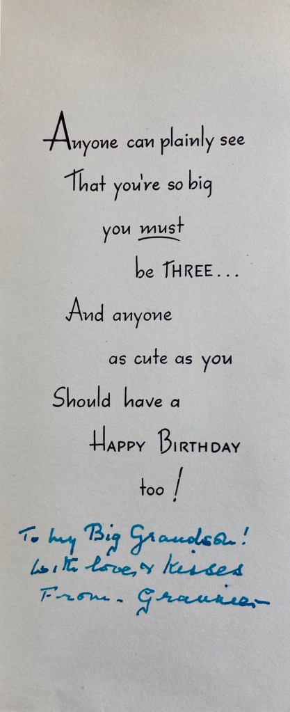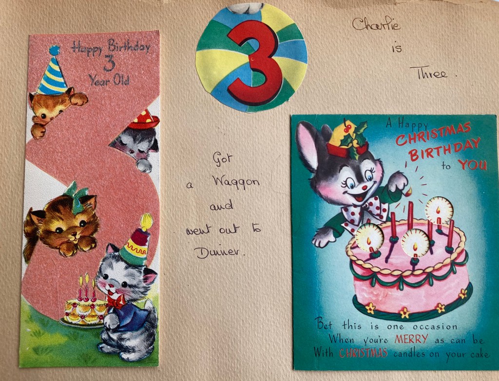 Charlie’ birthday was always the start of the holiday season for the children, with a big share-able present- in this case a wagon – wheels they could drive/ride around the unfinished basement with the tricycle when it was too cold to go out!