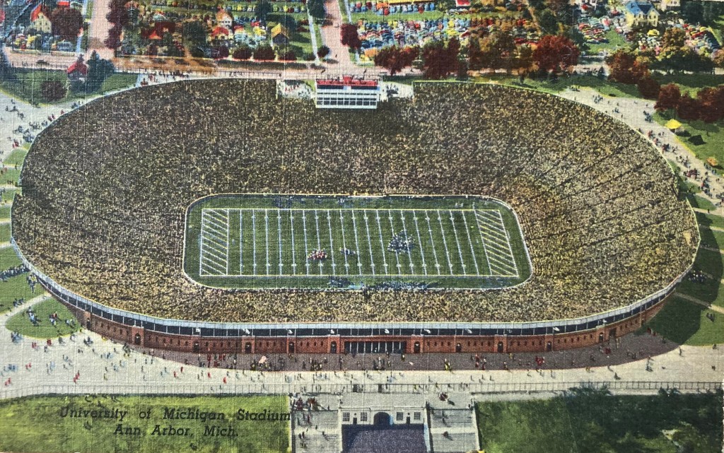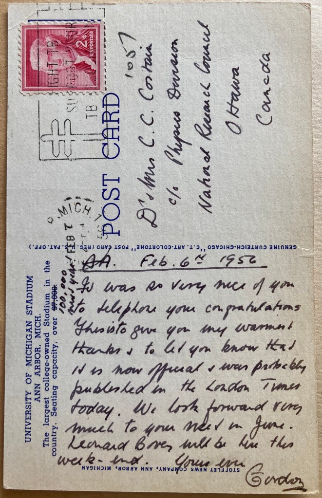Gordon Sutherland, Cec’s professor at Cambridge and his wife Gunborg, had become good friends with Cec and Cyn during their years at the University of Michigan, and in the early new year 1956 the science community heard that Gordon would be leaving the University of Michigan and returning to England to become the Director of the National Physical Laboratory. Cec called to congratulate him, and got in return a post card of the University of Michigan Stadium (annotated by Gordon to point out that its seating capacity of 97,000 would be raised to 100,000 next year!) of thanks: