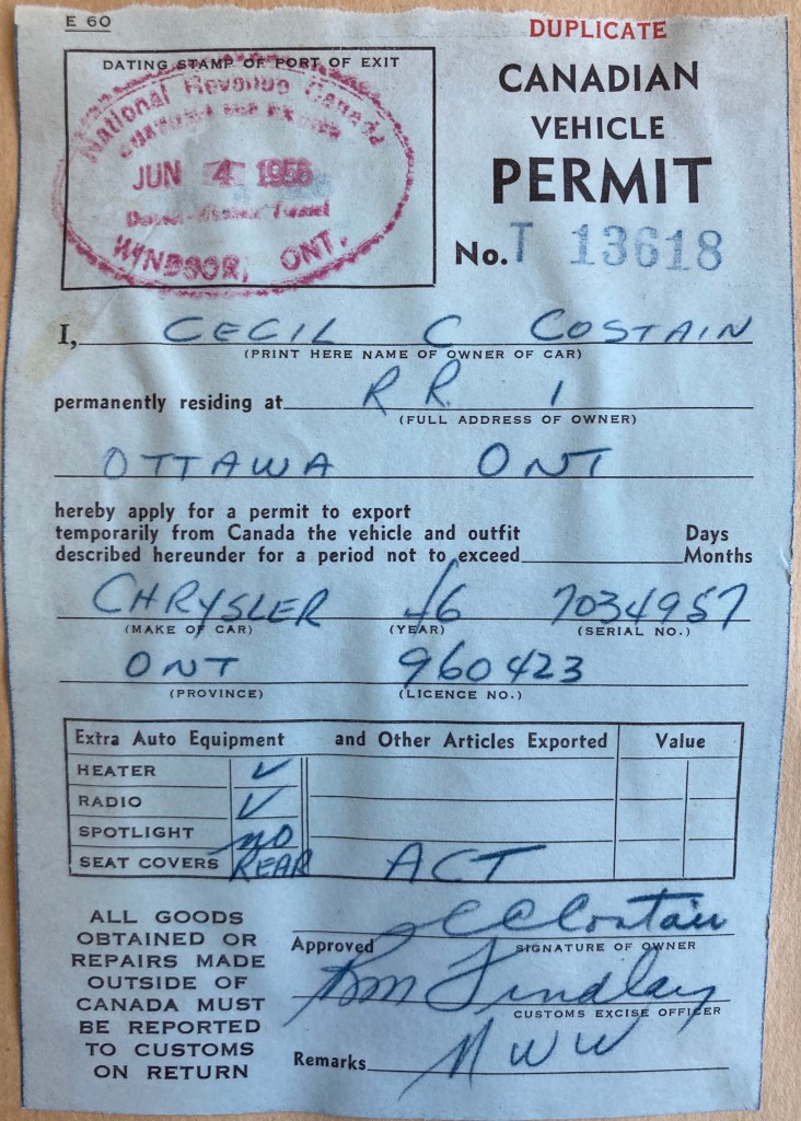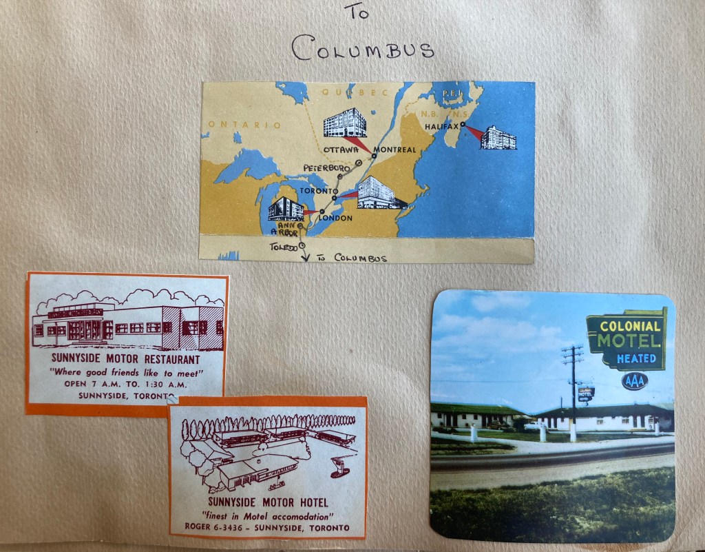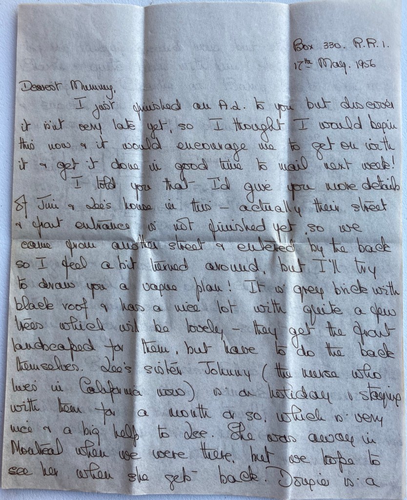 Dearest Mummy – Didn’t I get lost off with this letter? The last 2 weeks before we left were so hectic that I just didn’t seem to have a minute even to finish it, so finally I brought it along with me & I am writing this in a Motel in Chatham (half way between Toronto & Windsor.) I got your nice long letter just before I left & hope you won’t worry when you don’t hear from me for a little while but expect you will know I was busy getting ready for the trip.