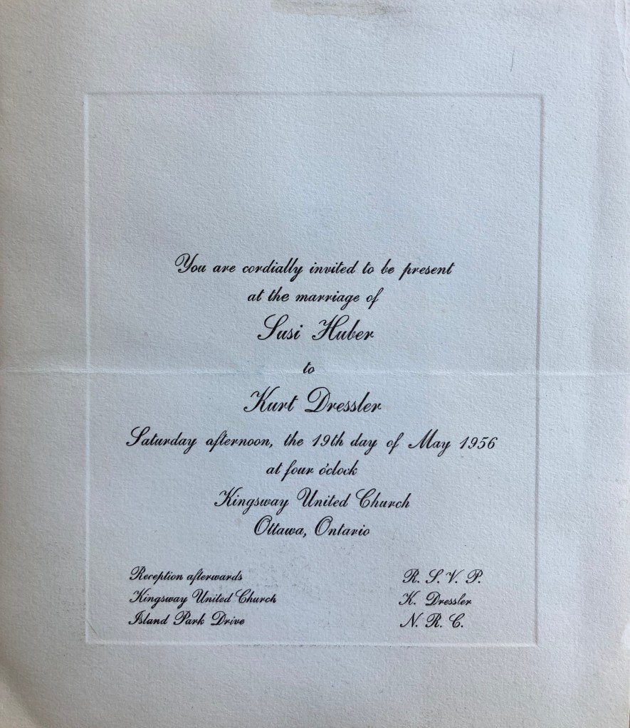 On Sat. the Swiss Fellow, Kurt Dressler (the one who made the funny remark about enjoying himself much more than he thought he would!) is getting married. His bride has come from Switzerland & we all thought they would get married very quietly, but he has invited all the Spectroscopy Dept. & is having a reception in the Church Hall, so it is very exciting. The Church is over on the Drive way not far from Jim & Lee & when the latter offered to keep the children we accepted with delight as we had asked Mrs. Martin to come but they were most unenthusiastic! (Linda said she would play outside & Mrs. Martin must never come out!) Mrs. M. was quite pleased to get out of it as she is very busy, so we are all happy now! While we were over at Jim & Lee’s last Sat. we went to Simpson’s Sears new store & I got a new hat – white with a brim – flat – & a veil – quite pretty – & also a wedding present – a set of square plastic kitchen canisters – flour etc. (red & white) – you know. Of course with the weather I have quite a problem what to wear! So I have 3 outfits lined up
