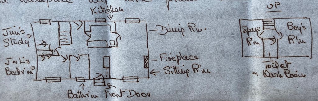 I told you that I’d give you more details of Jim & Lee’s house in this – actually their street & front entrance is not finished yet, so we came from another street & entered by the back so I feel a bit turned around, but I’ll try to draw you a vague plan! It is grey brick with black roof & has a nice lot with quite a few trees which will be lovely – they get the front landscaped for them, but have to do the back themselves. Lee’s sister Johnny (the nurse who lives in California now) is on holiday & staying with them for a month or so, which is very nice & a big help to Lee. She was away in Montreal when we were there, but we hope to see her when she gets back. Dougie is a big boy running around now, but still not talking – Charlie is quite taken with him! He is about 10 times as tough as Charlie as Barry treats him rough & knocks him about & he takes it all! Can you imagine my little plum blossom?!