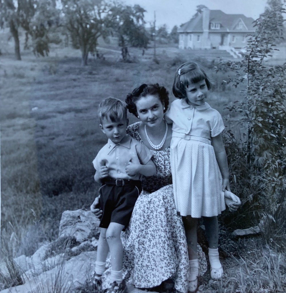 It has been such cold rainy weather that we are all wearing sweaters & coats & although I have our bags full of summer dresses I don’t know whether we’ll ever wear them! It rained all day today & I can hear the cars swishing by on the highway outside. We set out at 9 a.m. yesterday morning – a gray cool day – & drove to Peterborough (about 200 miles) to see the Haywoods who live there now. The children slept part of the way, but after they woke the road was quite bumpy for a bit & although I had Charlie in the front he said he felt funny & suddenly turned pale green & began to cry! We stopped & got out hastily & it did the trick – he had a little walk in the fresh air & a cookie & we went on in about 10 mins. time & he has been fine since, although of course we handle him with care!