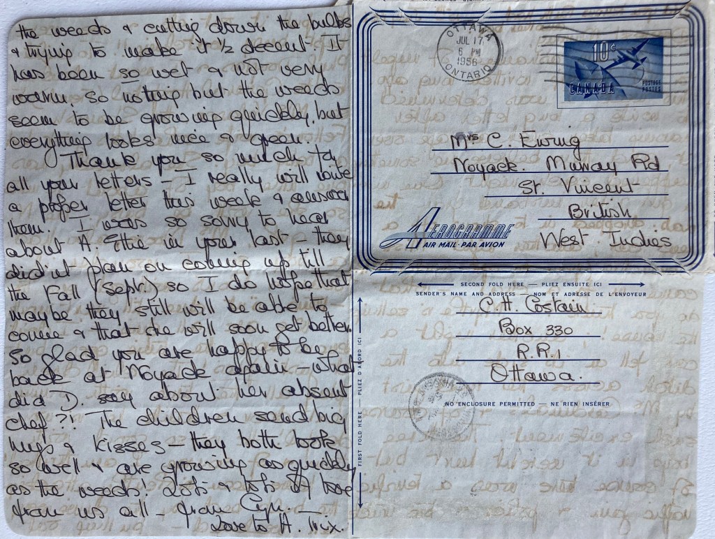 Another thing I should point out is that when the Hazell sisters visited family, because of the distances, they stayed for months! This has already been clear from the 4 to 6 month stays Carol made when visiting Cyn and Cec, but in 1956, Carol in St. Vincent is hosting her sister Trix (who lives in Trinidad) for the whole spring and summer it seems (Trix’s son and family- Bill and Janie- have moved to New Zealand which may explain this) while Muriel, who shares her house with Carol, is paying a visit to their sister Ettie in New York, and taking the opportunity to see her 3 nieces there, also planning to come see the Costains in the fall. However, Cyn keeps referring to Aunt Ettie’s health because apparently she has had a stroke although neither Carol nor Cyn know how serious it is.