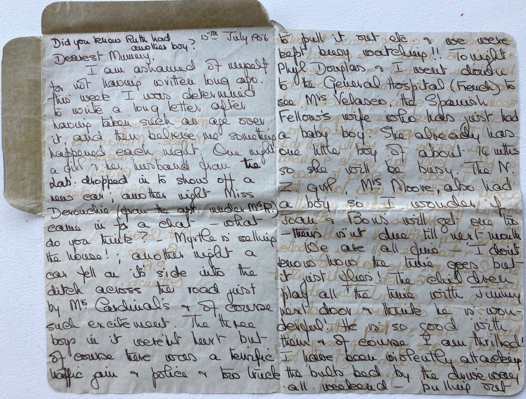 I am ashamed of myself for not having written long ago. This week I was determined to write a long letter after having taken such an age over it, and then believe me something happened each night. One night a girl & her husband from the Lab. dropped in to show off a new car; another night Miss Derouchie (from the apt. under Mrs. R.) came in for a chat [Mrs Myrtle Rothwell lived in the other half of the duplex, which had a basement suite] – what do you think? – Myrtle is selling the house!; another night a car fell on its’ side into the ditch across the road just by Mrs. Cardinal’s & of course such excitement. The three boys in it weren’t hurt but of course there was a terrific traffic jam & police & tow truck to pull it out etc. & we were kept busy watching!! Tonight Phyl Douglas & I went down to the General Hospital (French) to see Mrs. Velasco – the Spanish Fellow’s wife who has just had a baby boy. She already has one little boy of about 14 mths so she will be busy. The N.Z. girl, Mrs. Moore, also had a boy so I wonder if Joan & Boris will get one too – theirs isn’t due till next month.