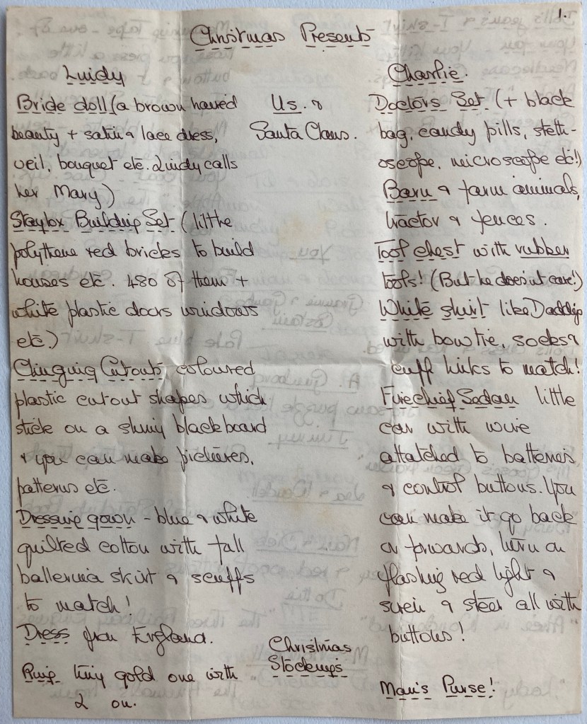 This Christmas entry focuses on the presents that Cyn and her friends exchanged and certainly emphasizes what privileged and lucky children my brother and I were, with such a variety of gifts sent to us from so many people. But I want to point out that this practice forged connections, and by this age, Charlie and Linda were involved in some aspects of the gift selection, wrapping, parcels making, and, as Cyn’s letter just before measles confined them all to the house says, she and Charlie were successfully mailing the packages a week before the Post Office’s overseas deadline.