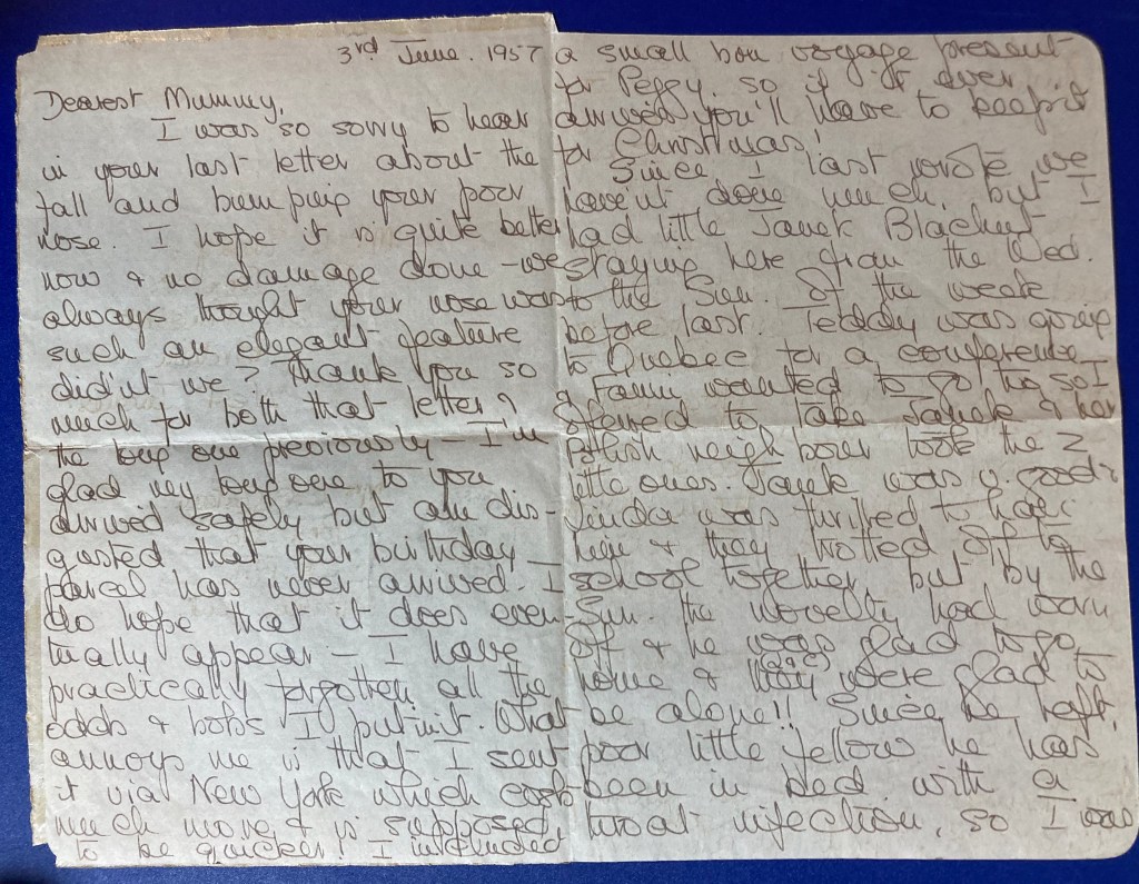 I was so sorry to hear in your last letter about the fall and bumping your poor nose. I hope it is quite better now & no damage done – we always thought your nose was such an elegant feature didn’t we? Thank you so much for both that letter & a long one previously – I’m glad my long one to you arrived safely but I am disgusted that your birthday parcel has never arrived. I also hope that it does eventually appear – I have practically forgotten all the odds & bobs I put in it. What annoys me is that I sent it via New York which costs much more & is supposed to be quicker! I included a small bon voyage present for Peggy, so if it ever arrives you’ll have to keep it for Christmas!