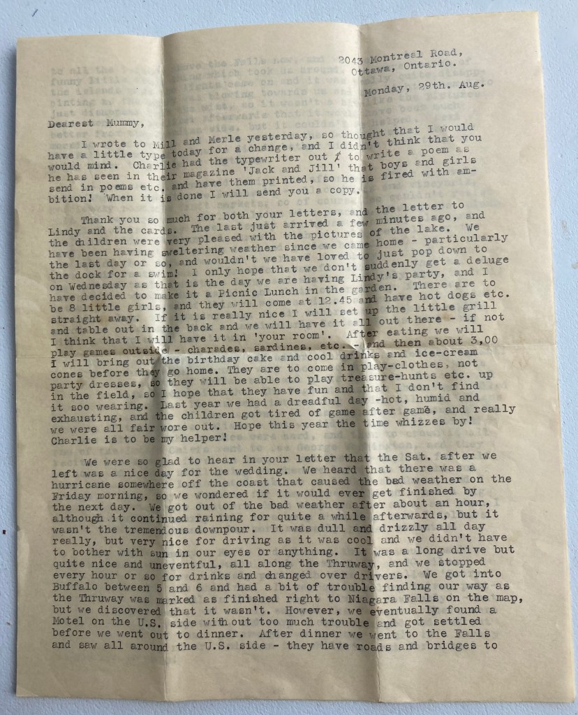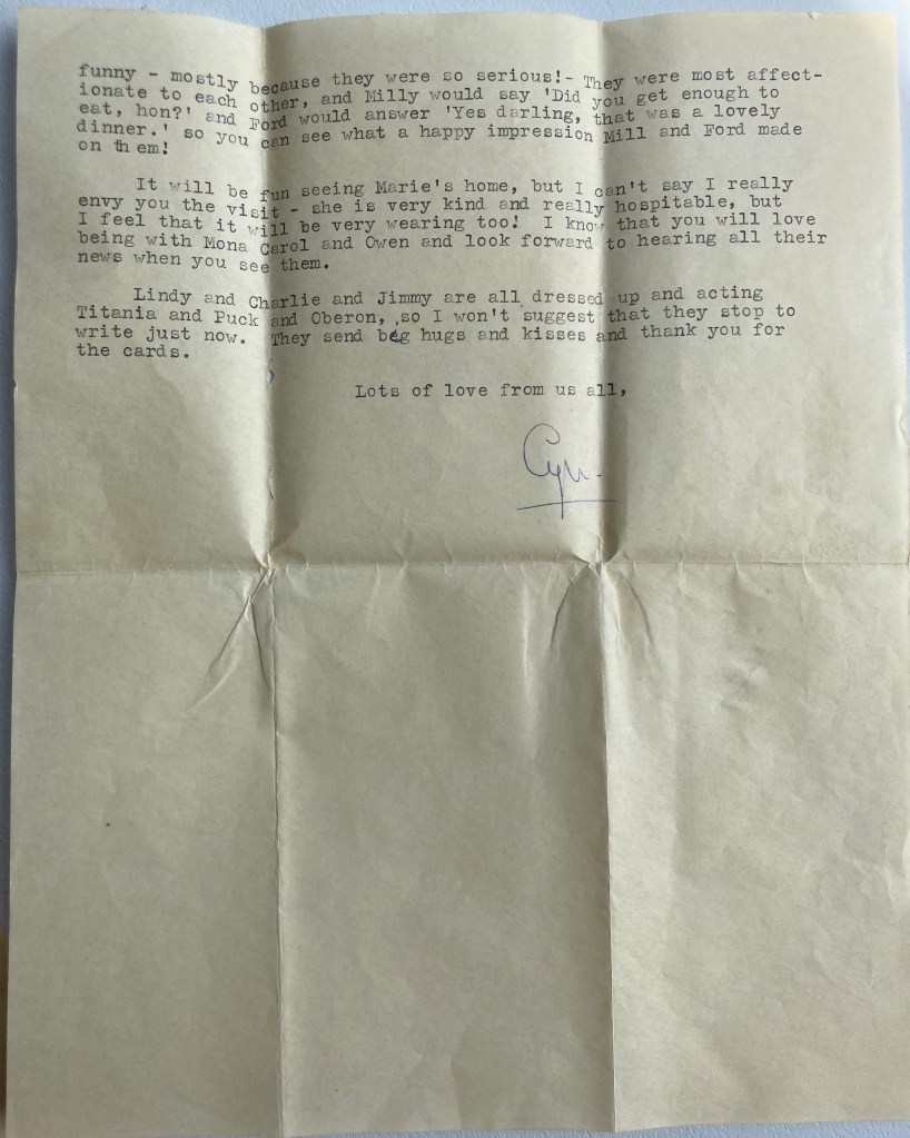 I must stop now and do some housework and try to get some ironing done – I can see that what with making B’day cakes and cookies etc. and then the party I shall be busy till Thursday, so I had better get Cec some shirts to wear. I am looking forward to hearing all about the wedding when we see you again, and I am so glad that you had the blood test done and hope that it is fine. We enjoyed hearing about the babies and Monie – I had a nice little note from her when I got back. By the way, Cec and I were so tickled on the way home – the children had a lovely new play in the back of the car – acting Ford and Millie! Charlie would be Ford showing pictures, and Linda would be Millie and it was really uproariously funny – mostly because they were so serious! – They were most affectionate to each other, and Millie would say “Did you get enough to eat, hon?” And Ford would answer “Yes darling, that was a lovely dinner.” So you can see what a happy impression Mill and Ford made on them!