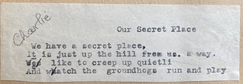 I wrote to Mill and Merle yesterday, so thought that I would have a little type today for a change, and I didn’t think that you would mind. Charlie had the typewriter out to write a poem as he has seen in their magazine ‘Jack and Jill’ that boys and girls send in poems etc. and have them printed, so he is fired with ambition! When it is done I will send you a copy.